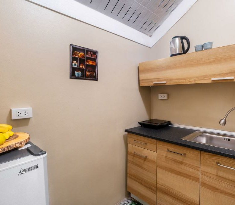 A comfortable extra bed or cot can be added for a child at request. A small kitchenette has a fully sized fridge and is fully stocked to cook or warm up your food.