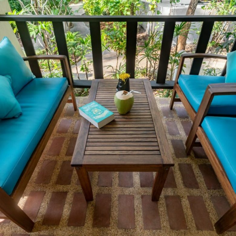 It opens into a cozy 15 m2 terrace with a dining table where you can enjoy your breakfast overlooking tropical garden.
