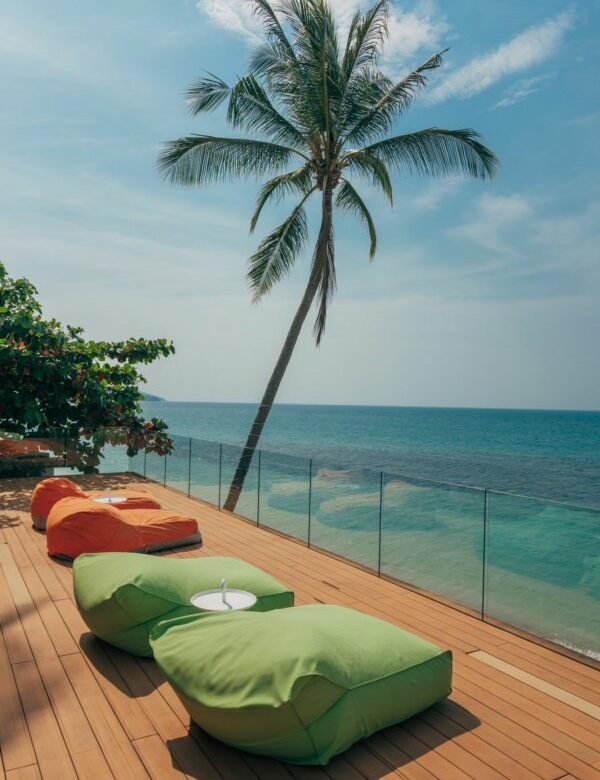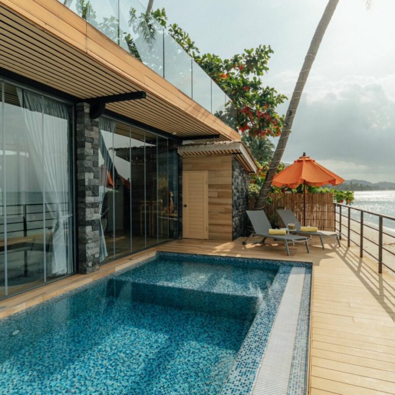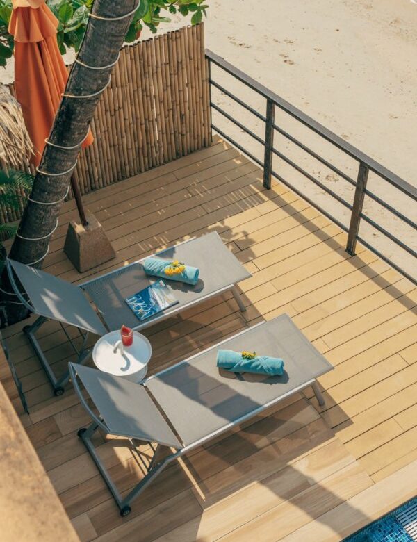 – a beachfront pool terrace with an outside sitting area and sun beds.