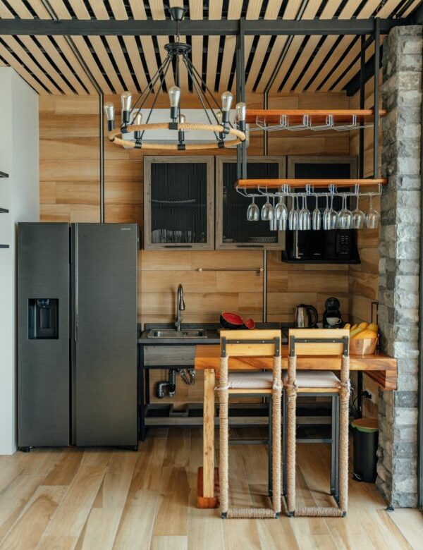 – In villa kitchen with a bar counter;