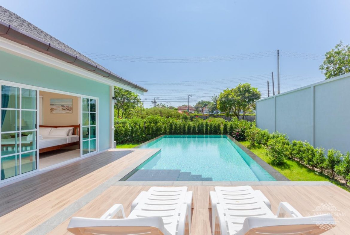 The modern two bedroom pool villa is surrounded by beautiful gardens and is stylishly decorated throughout and features a private garden and parking area. The villa is spacious and fully furnished and has plenty of space by the pool and sun loungers to relax outdoors amongst nature.