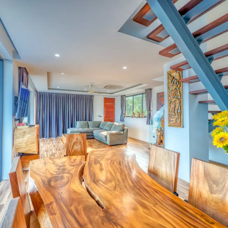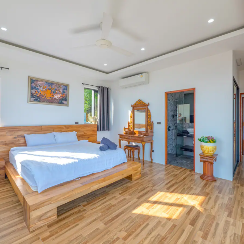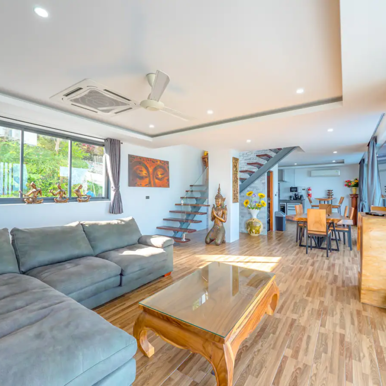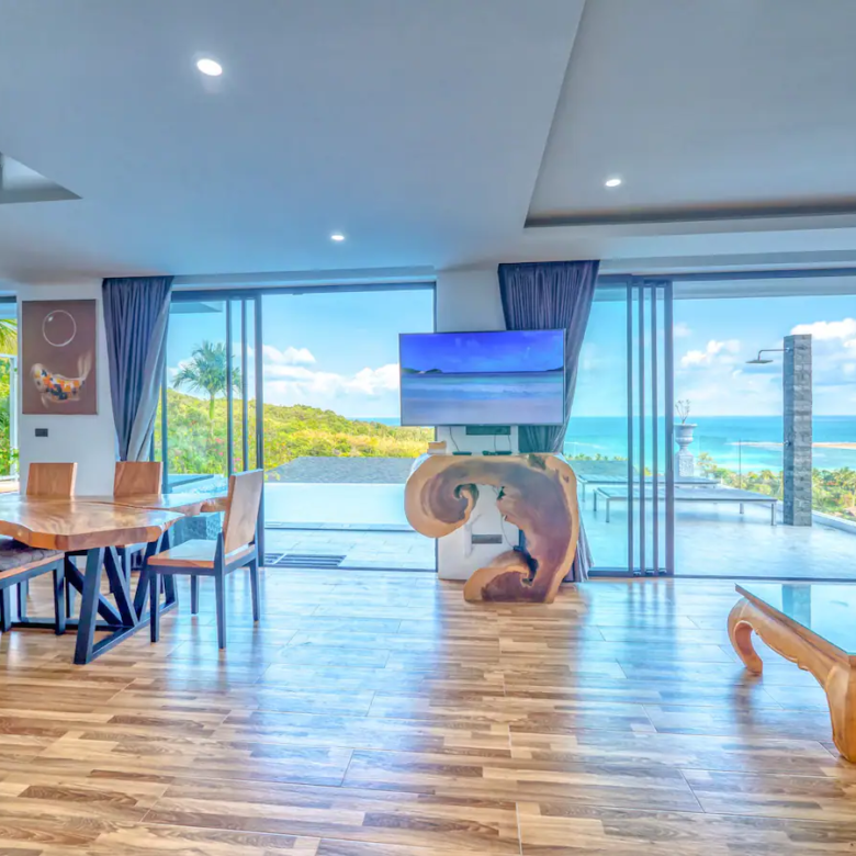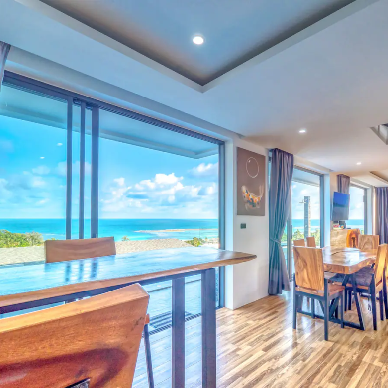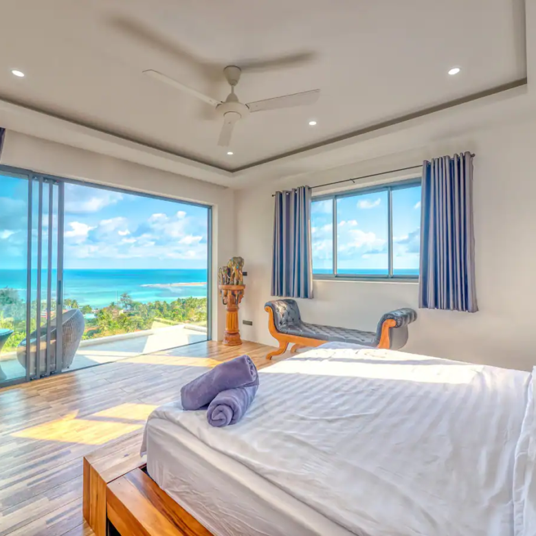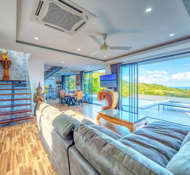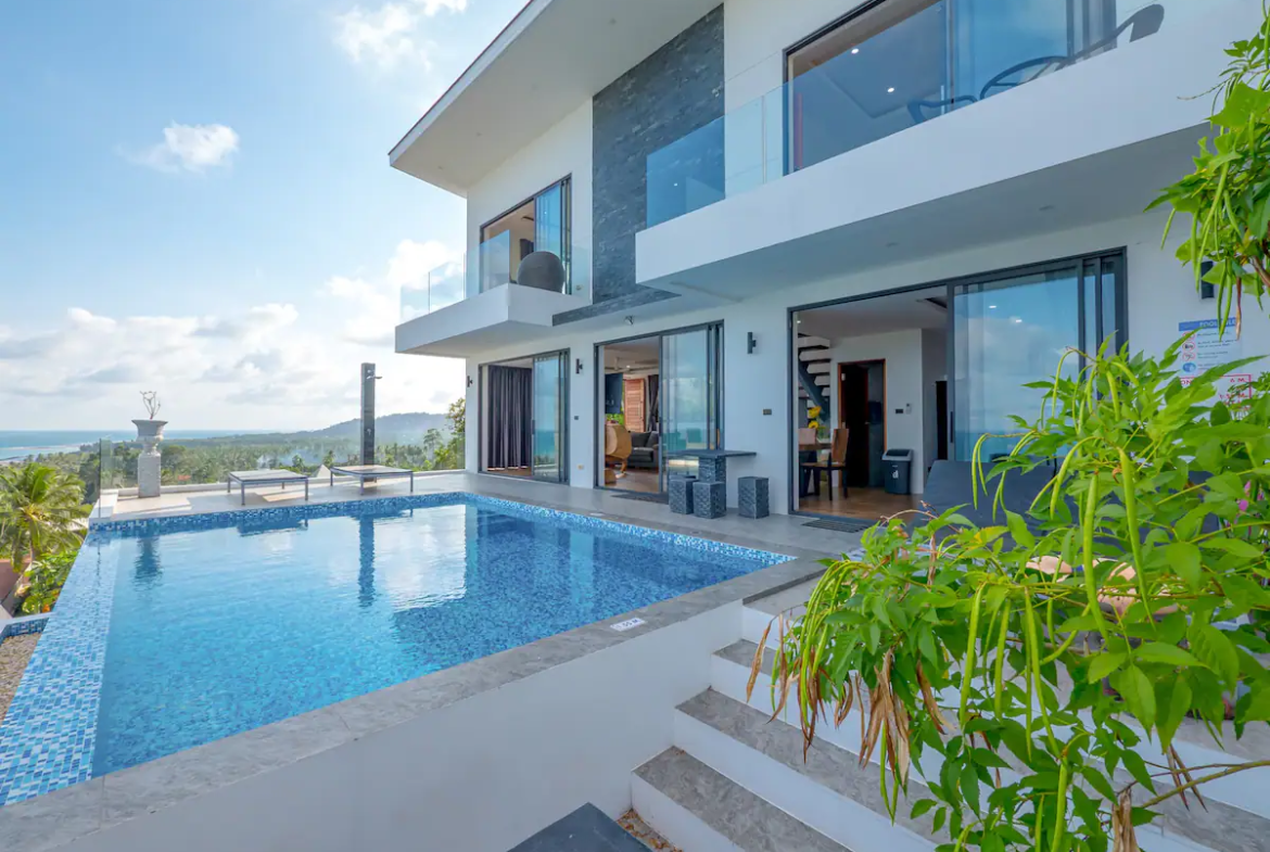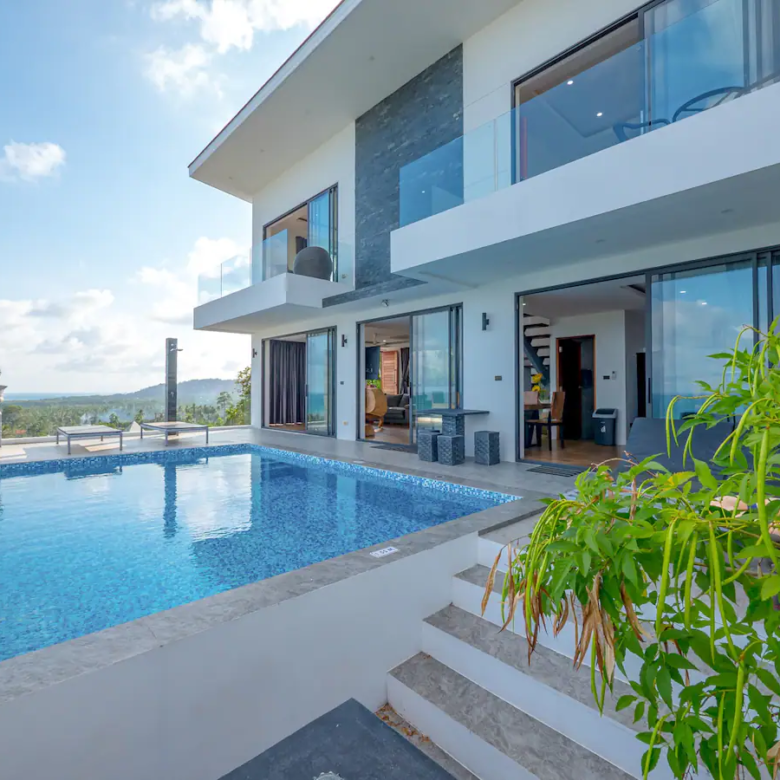 2 villas are sold here including a chanote in Maret. The upper villa is a 3 bedroom villa with 3 bathrooms and a European kitchen and a great sea view.