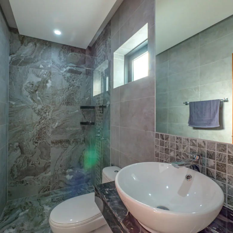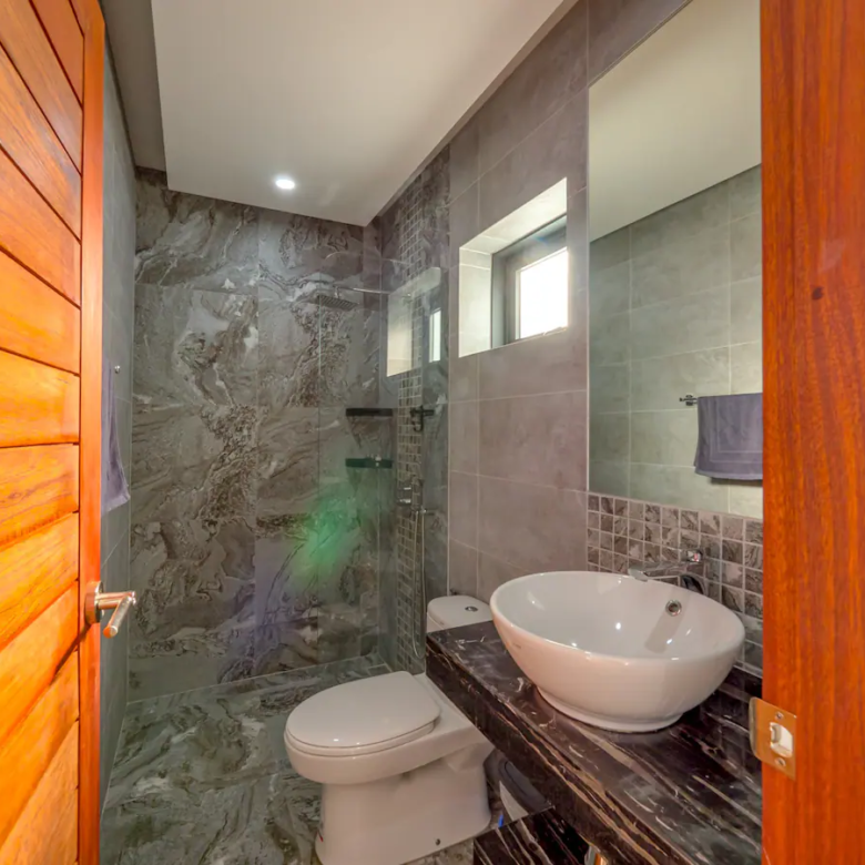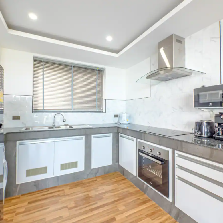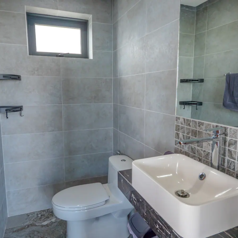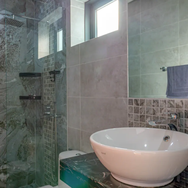 The lower villa is a 2 bedroom with 2 bathrooms and a European kitchen. It also has a very nice sea view.