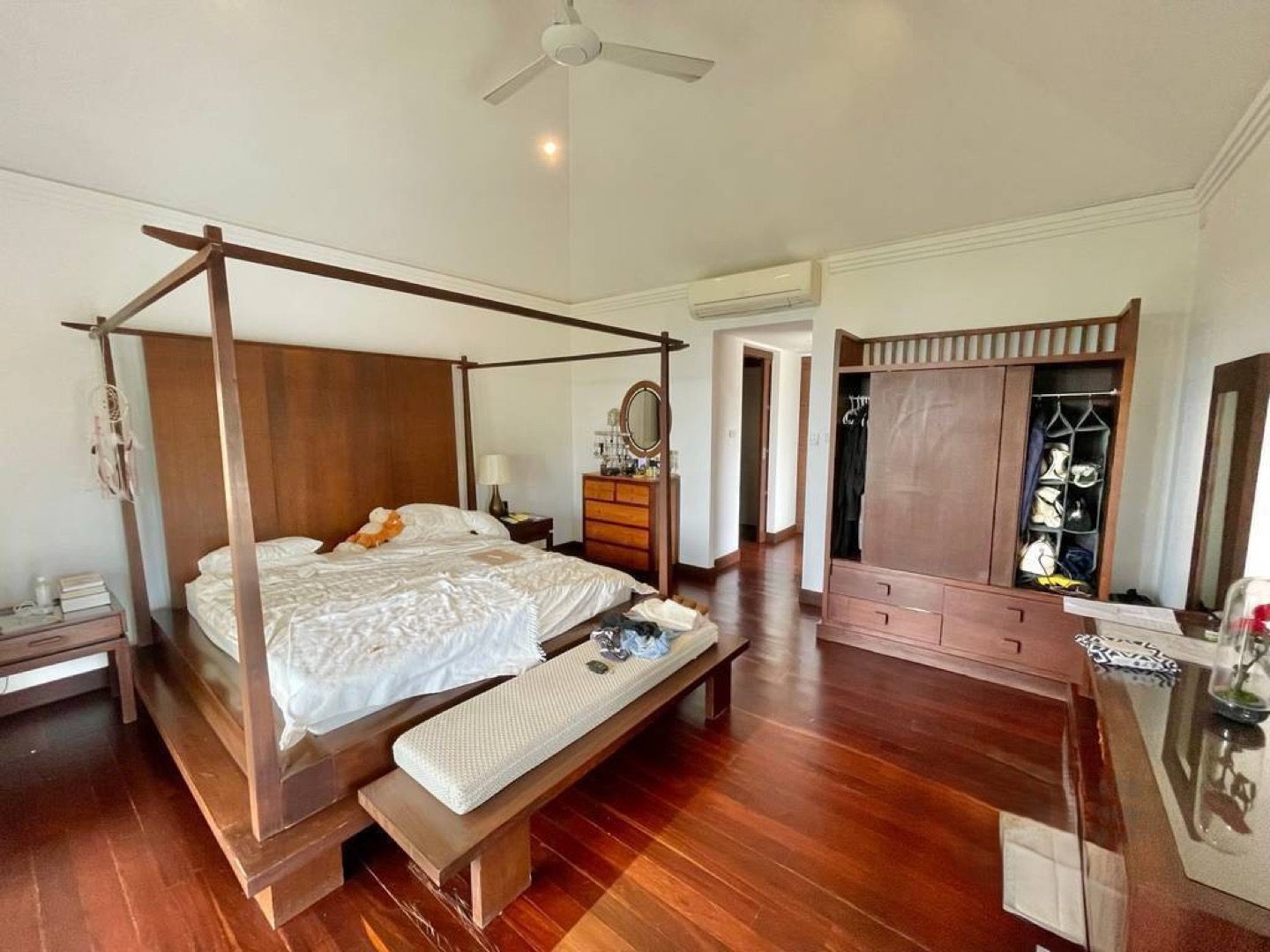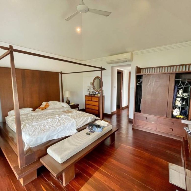 From the gated entrance, the property opens into a spacious terrace that flows directly to the swimming pool, framed by sweeping sea views. The rear pavilion houses the openplan living and dining area, enhanced by vaulted ceilings and large sliding glass doors that invite natural light and breezes. A well appointed kitchen sits at the back, complemented by a dedicated laundry room. The master suite features a romantic four poster bed, an ensuite with bathtub and shower, and direct access to a private balcony overlooking the sea. Two additional guest bedrooms, each with its own ensuite, are located in the third pavilion, with the front bedroom enjoying its own seaview balcony. A charming wooden sala beside the pool provides shaded relaxation, perfect for lazy afternoons or sunset gatherings.
