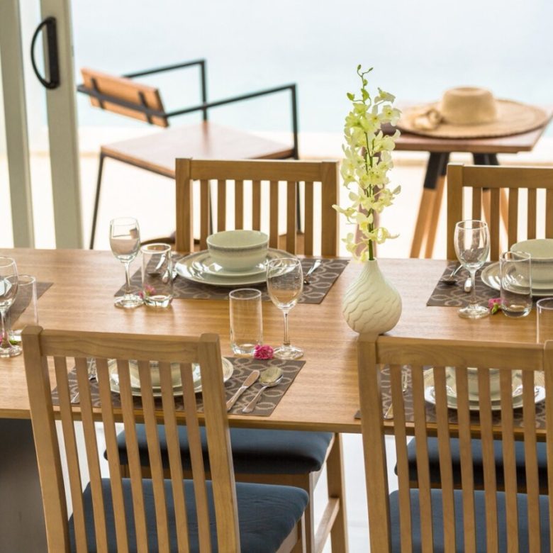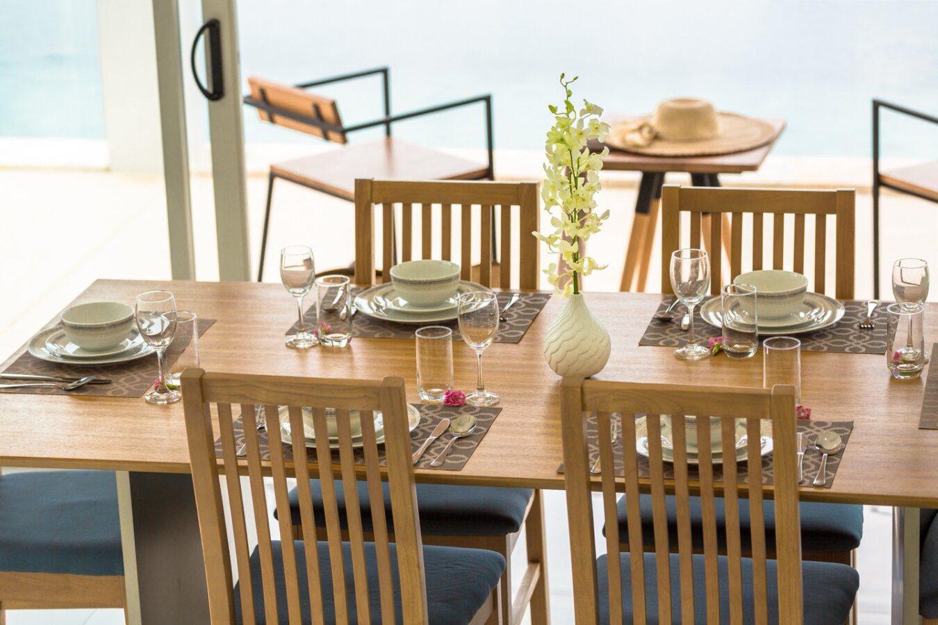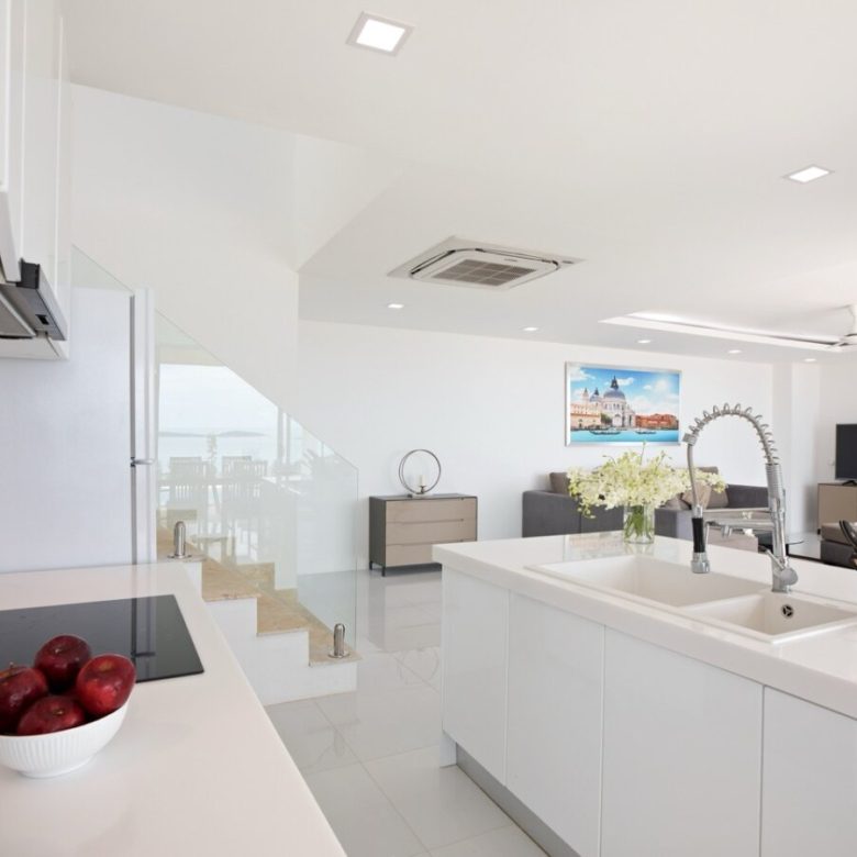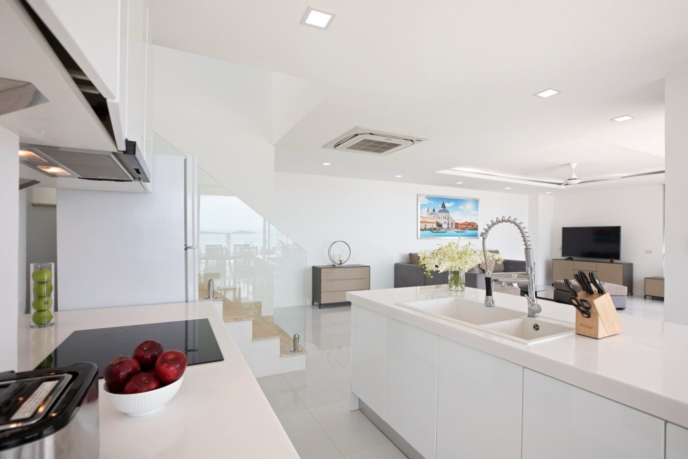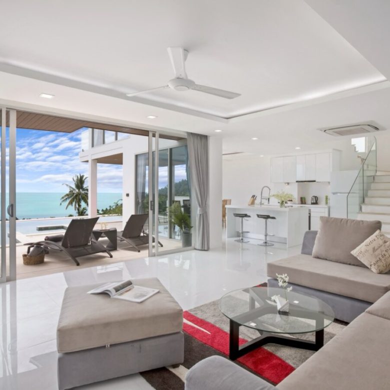 The two-storey design separates communal living areas from private bedrooms, creating a natural flow throughout the home. The open-plan living room extends directly toward the private swimming pool terrace, allowing the sea view to become part of the everyday experience. This integration of interior and exterior space is exactly what short-term rental guests seek, and it directly impacts booking desirability.