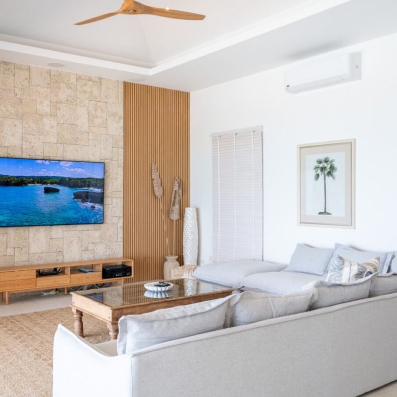The spacious lounge and TV room, with bi-folding glass doors on two sides, effortlessly extends to the outdoors, creating a seamless indoor-outdoor living experience. The 10-meter-long swimming pool serves as a centerpiece, separating the master bedroom with an ensuite bathroom from the two additional guest bedrooms, each also featuring ensuite bathrooms and balconies with stunning sea views.