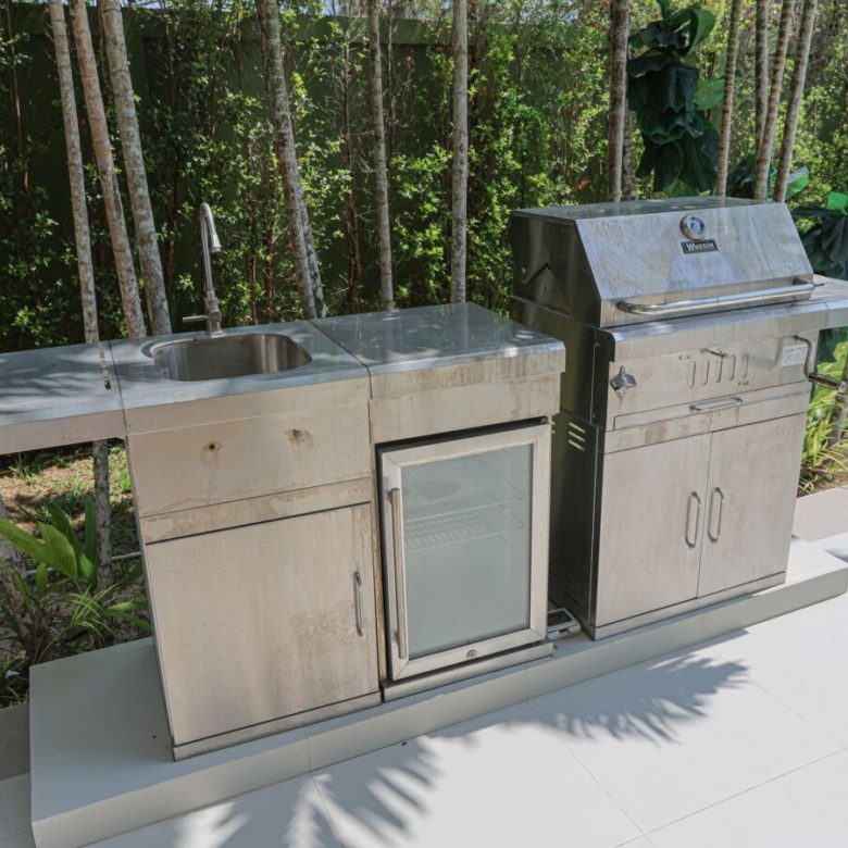 Fully Equipped Kitchen: Includes kitchenware, a BBQ stove, a wine fridge, and a dishwasher