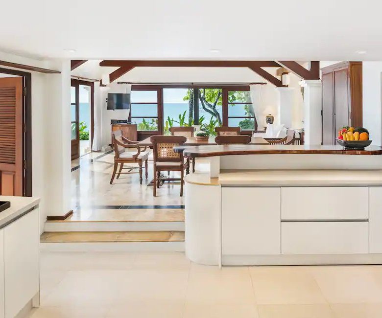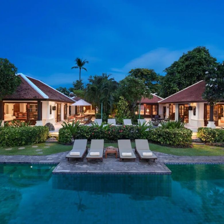 This Villa with 7 bedrooms has two pavilions, each with 330 square metres of living space and terrace and courtyard area, are located next to each other overlooking a beautiful white sandy beach with Koh Phanghan in the distance. There is a large living room with all amenities including satellite TV and a music system. Sliding doors from all living areas and master bedrooms open onto large teak decks, ideal for dining or just relaxing with a good book.