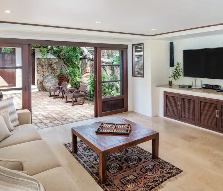 Each pavilion has 3 air-conditioned bedrooms (2 doubles and 1 twin), all with en-suite bathrooms. The master bedrooms overlook the beach and have luxurious bathrooms with a secluded outdoor Balinese bath and shower. All rooms are furnished and finished to a very high standard. There is a third building near the entrance of the property which has the gym, the seventh bedroom and a bathroom with a bath as well as a shower.