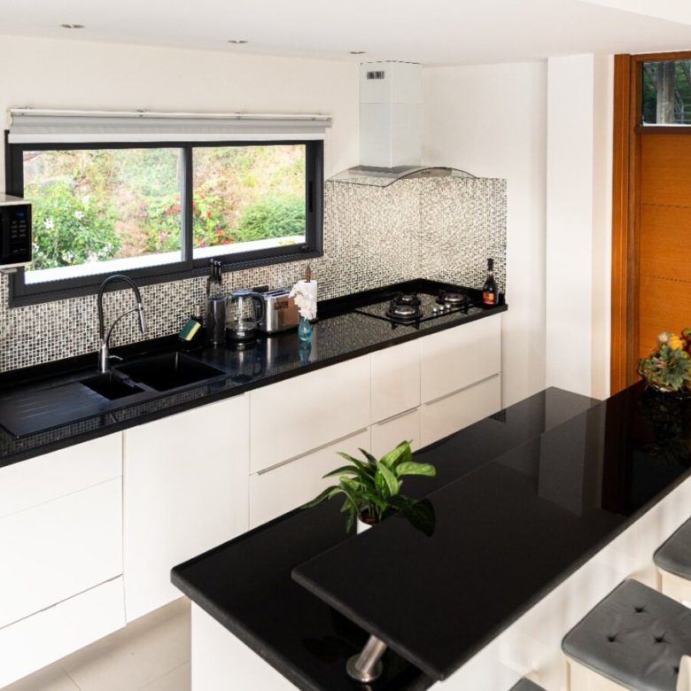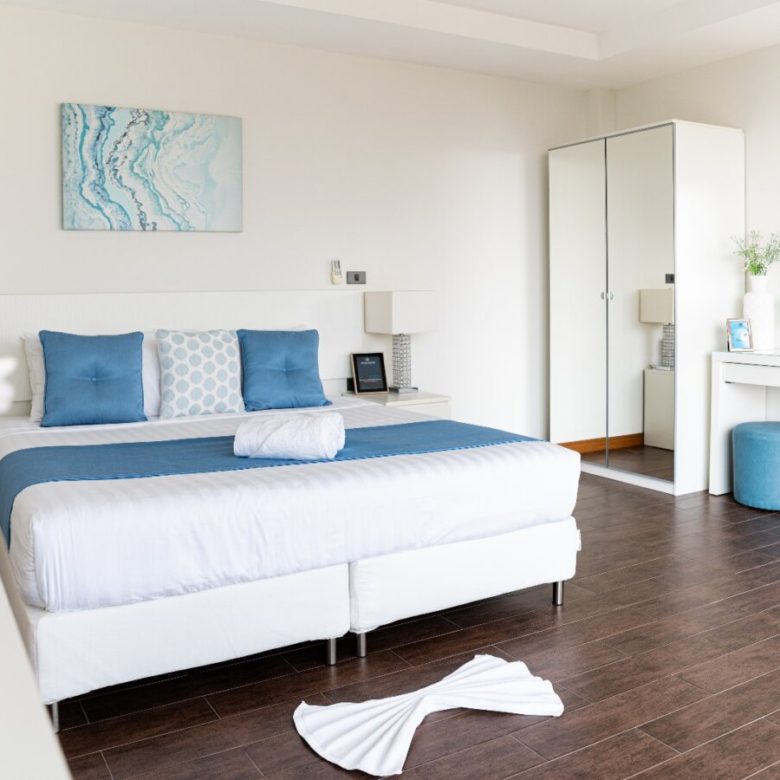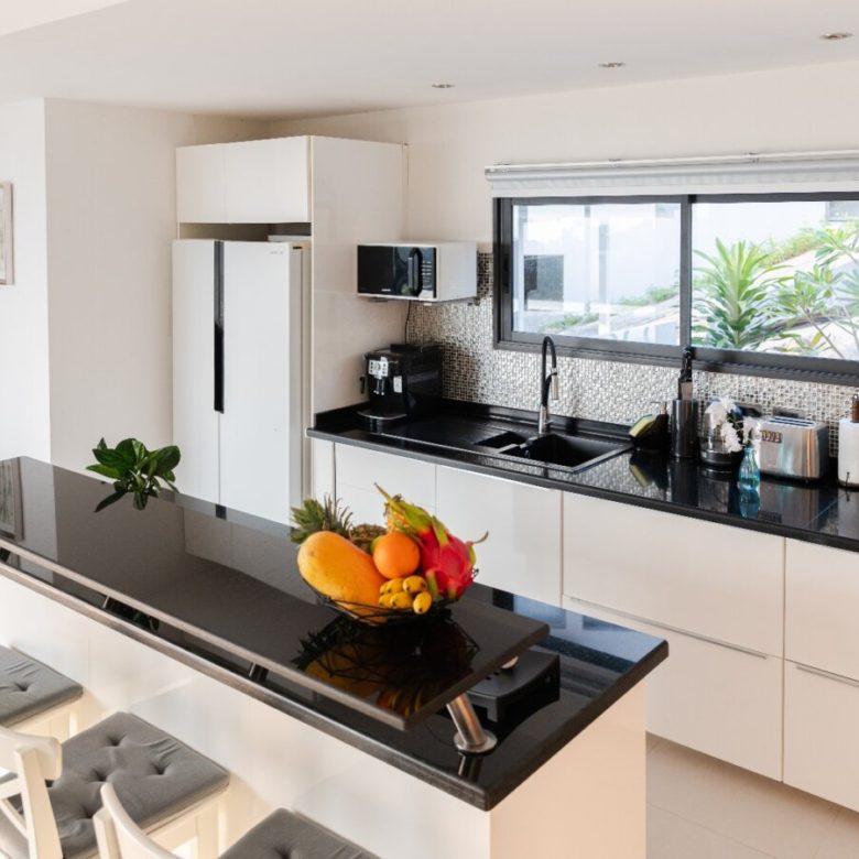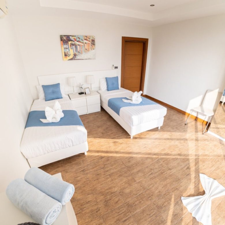 On the ground floor, it has 2 large bedrooms, fully equipped and air-conditioned, with their own bathroom, a large dining room with open kitchen, modern European style with direct access to the terrace where you can enjoy its lounge area, the barbecue but also its swimming pool with a superb sea view.
