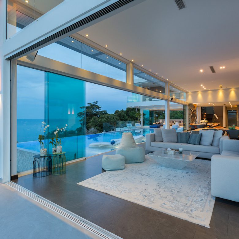 The spacious entrance leads you directly to the living room with its breathtaking View enhanced by the floor to ceiling glass walls that maximize light and space. The entire glass front can be opened and removed to enjoy a combination of patio and living room embraced by the 96 sqm infinity pool (including resting areas).