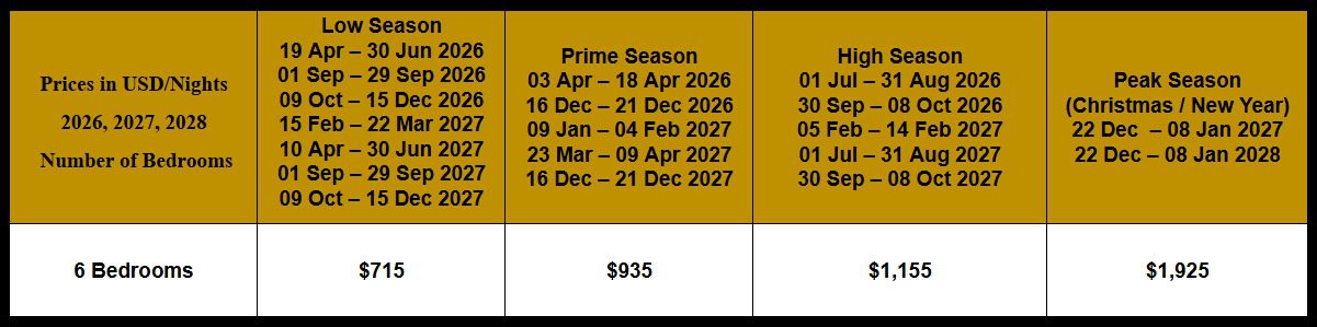 The villa has two master suites and four large double bedrooms, all with air-conditioning, roof-fans, en-suite bathrooms, private terraces and spectacular ocean views. Most bedrooms have fold out sofas to offer sleeping options for children.