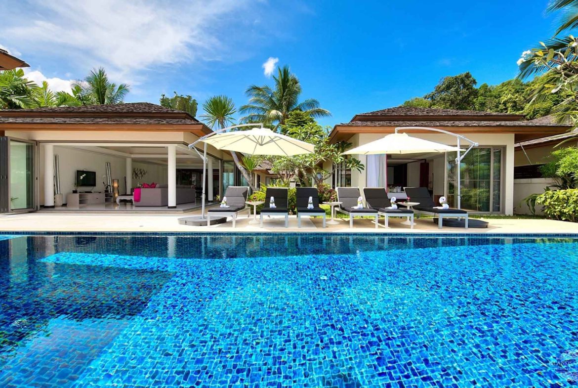 Baan FeungFah meets and exceeds its expectations of a private luxury haven. First impressions are good – with an imperial-like wooden entrance, heavily carved wooden doors and a pagoda-style roof. Once inside, the tropical landscaping unfolds and becomes the connecting thread between each pavilion. The living pavilion is conveniently located in front of the decked sun terrace, blue-tiled infinity swimming pool, and large al fresco sala, which can be accessed via sunken stepping stones in the pool.