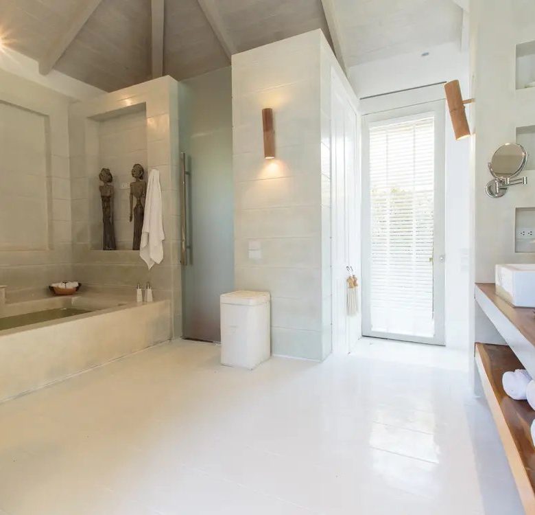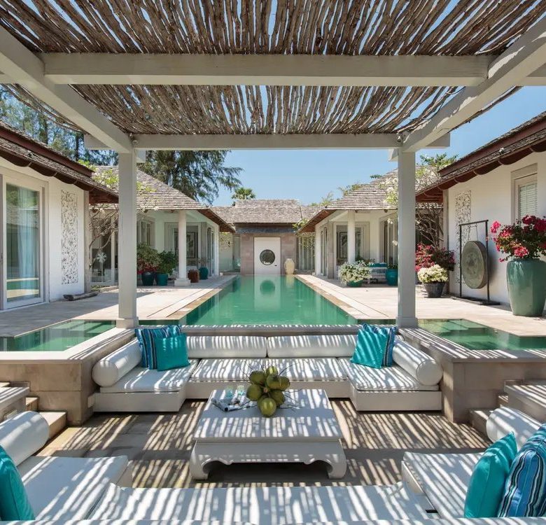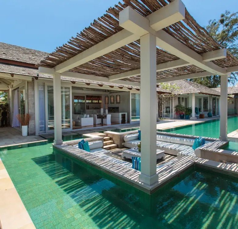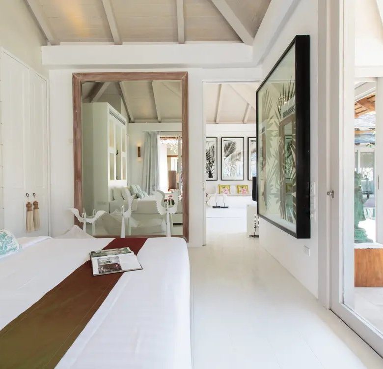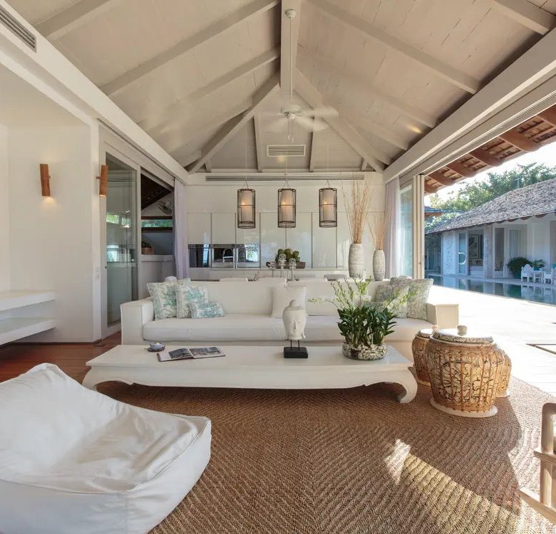 The palatial proportions of this villa include high vaulted wood-panelled beamed ceilings. The building is roofed with cedar shingles and all rooms have sliding glass walls that open to verandas on the pool deck. The high ceilings are painted white, giving all 6 bedrooms brightness and a clean, modern feel.