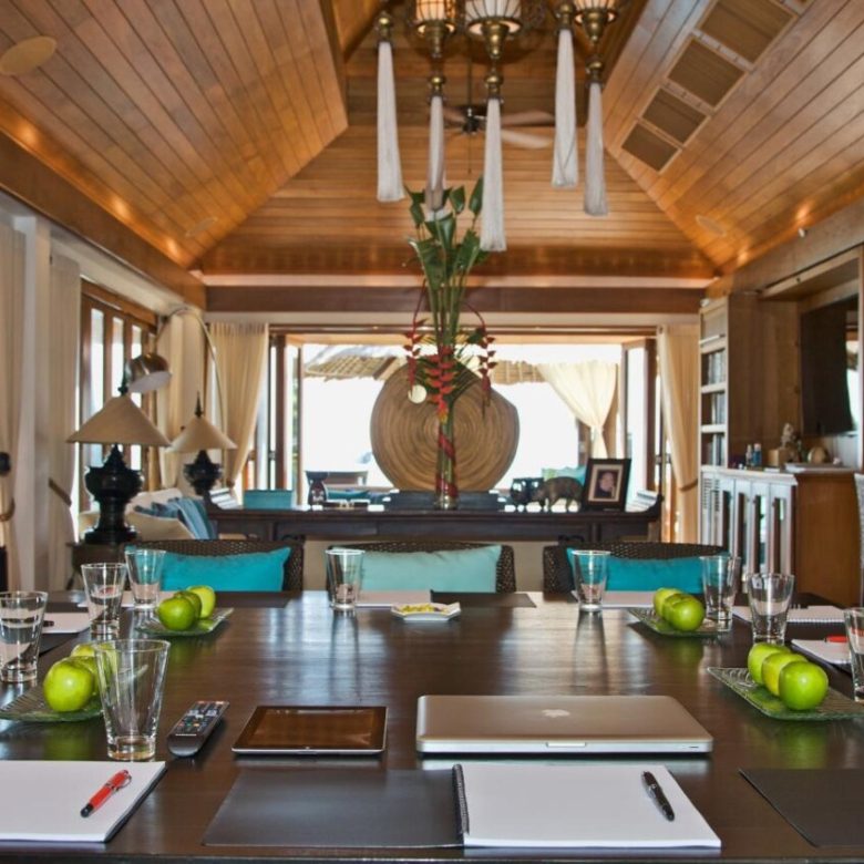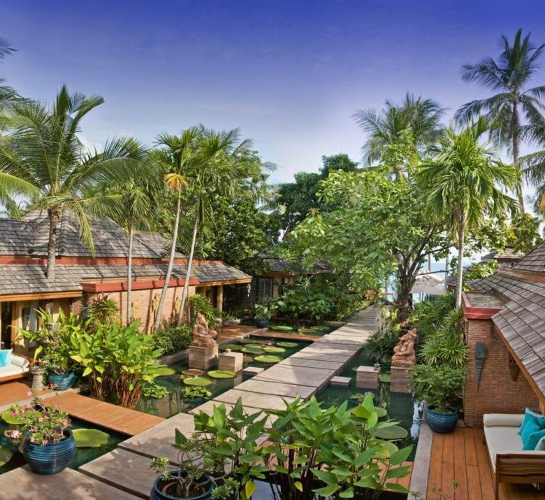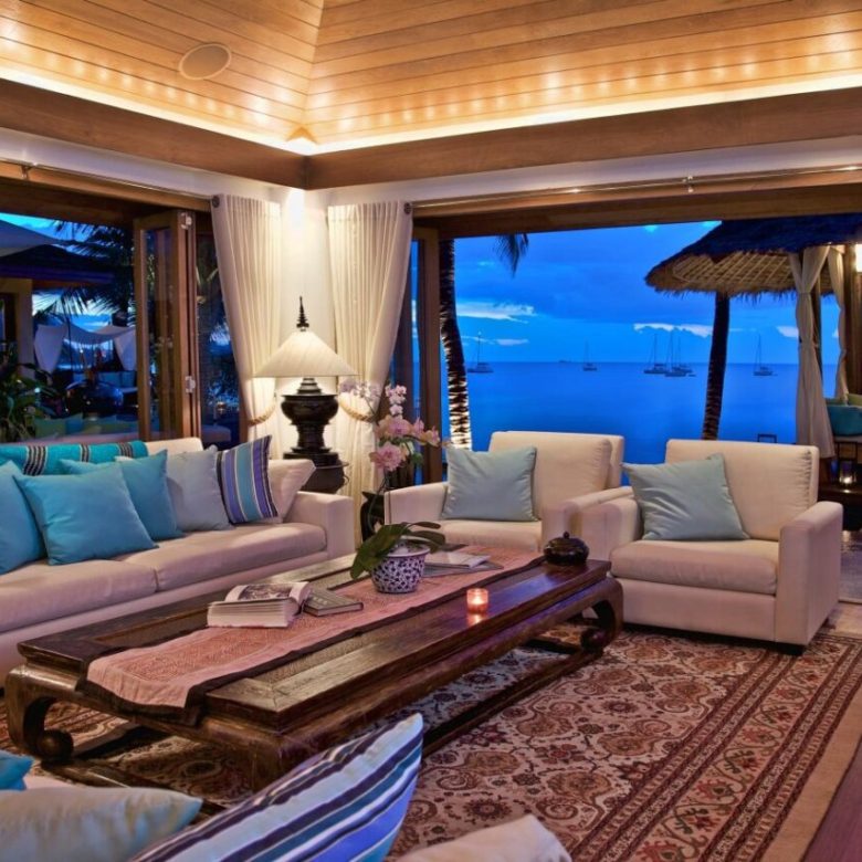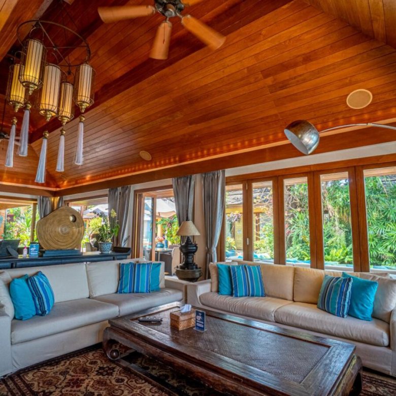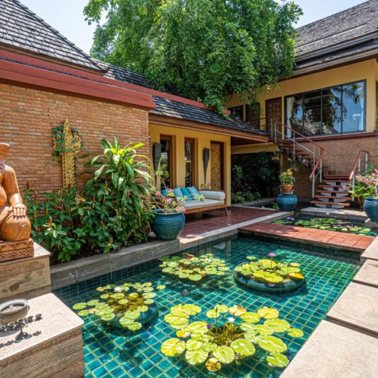 The villa boasts one of the largest and most beautiful beachfront pools and is designed in a very charming thai/mughal styled pavilion design with a pathway flanked by koi carp laden pools with beautiful goading lotuses and a very cozy living area and large master pavilion at the waterfront .
