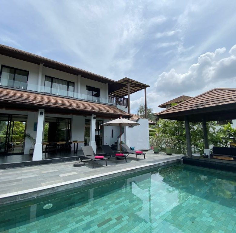 This villa is the perfect fit for everyone, who enjoys spending time in a quiet, private environment surrounded by a large and beautifully arranged garden. The outside area is complemented by a sizeable pool with Sukabumi green stone from Bali and a covered patio seating area. The villa has 3 bedrooms and 5 bathrooms and is fully furnished. Each of the bedrooms is equipped with a queen-sized bed and a separate air conditioning unit to ensure a good sleep. The furniture has a high, luxurious quality and impresses with a beautiful variety of brown highlights throughout the villa. The living area is open planned with a European style kitchen, a dining area in the center of the room and a TV and seating area opposite to the kitchen. The villa is located in Maenam in the north of the island and all daily needs are located within a short driving distance: