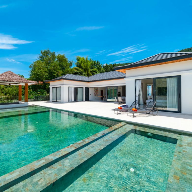 The villa itself is part of a beautiful brand new small development of modern homes that boarders beautiful nature and is next door to the largest private villa in Bophut .