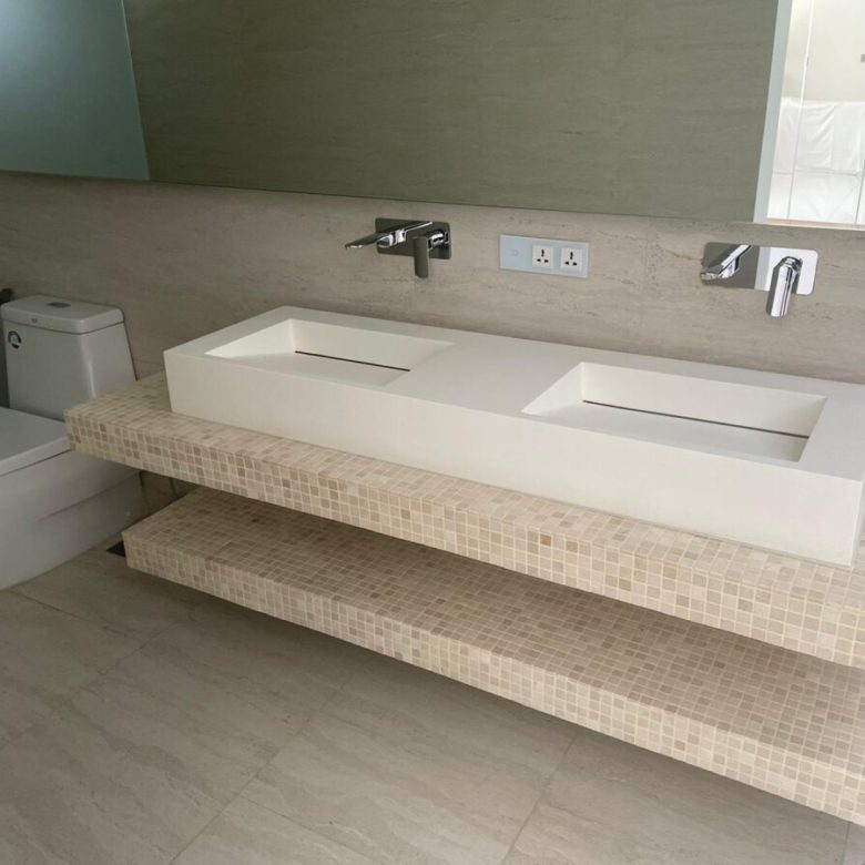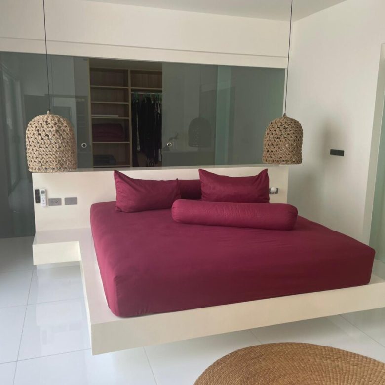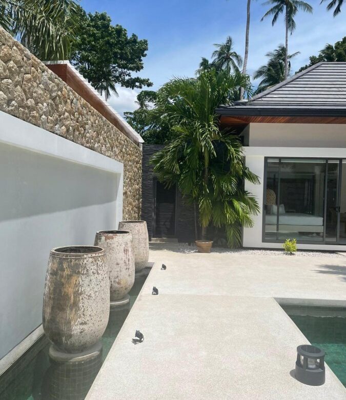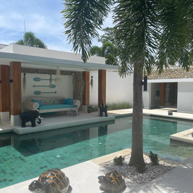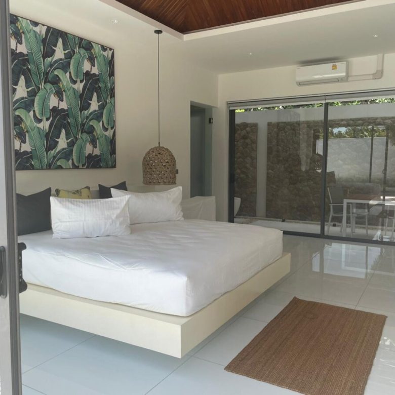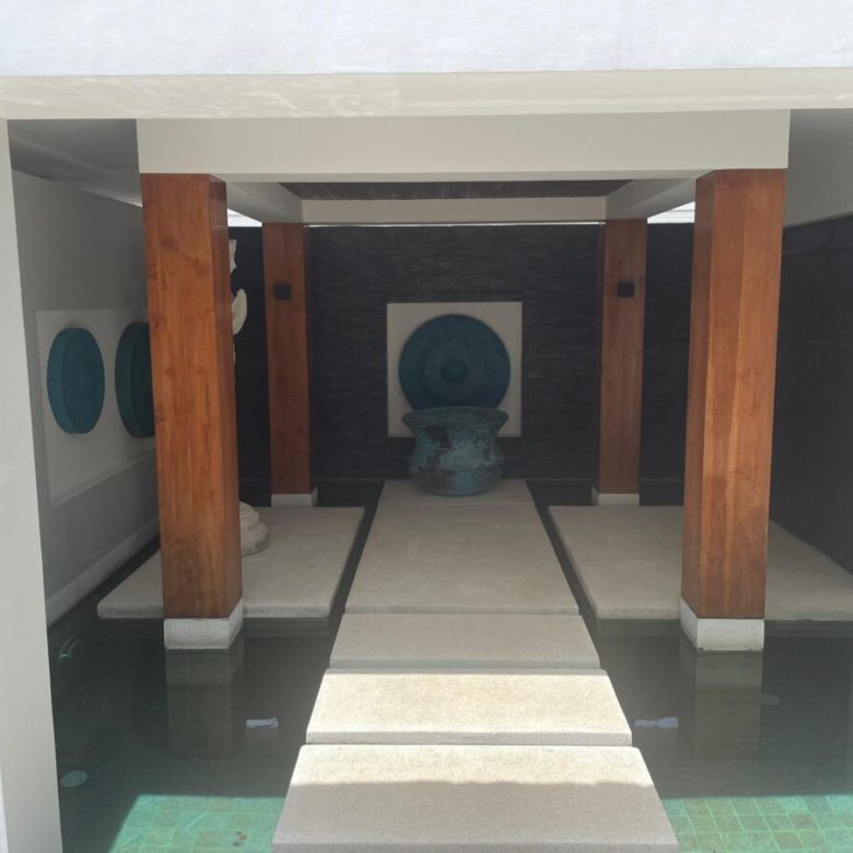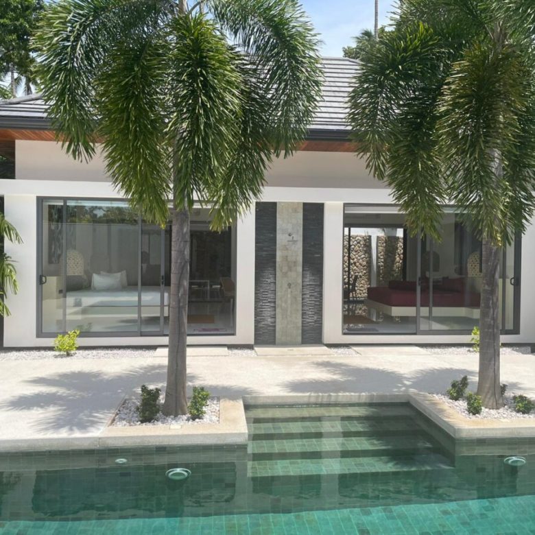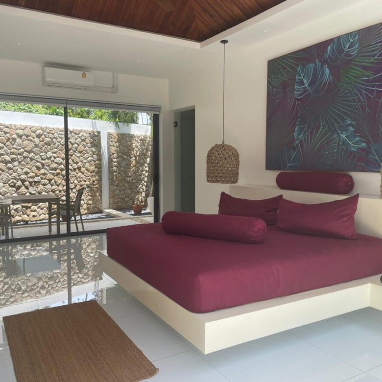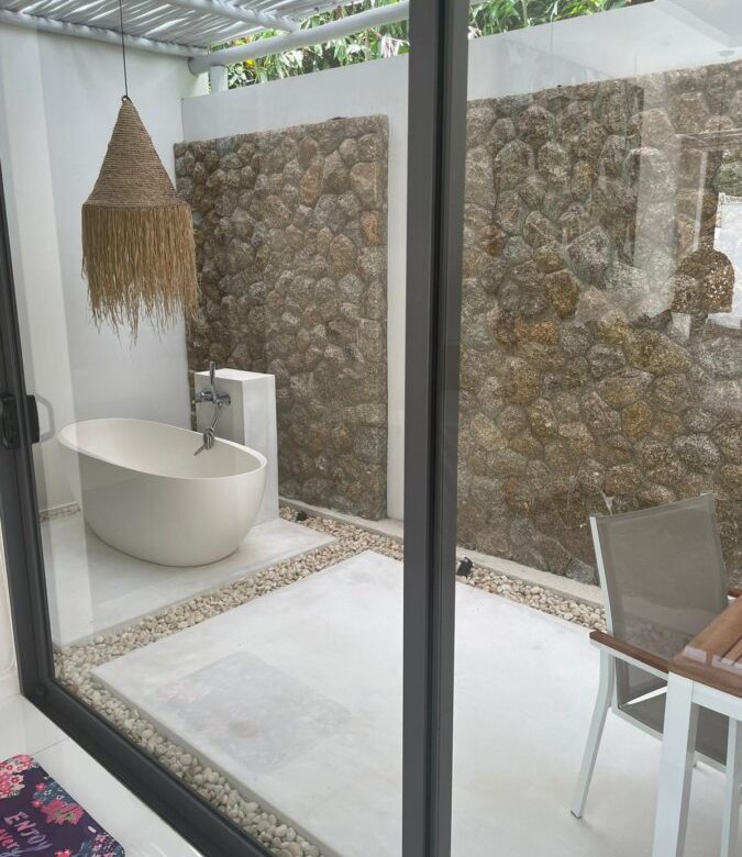 On the left side you have 2 bedrooms with 2 bathrooms and outside bathtub, The main part of the villa has one bedroom, one bathroom and a guest toilet.