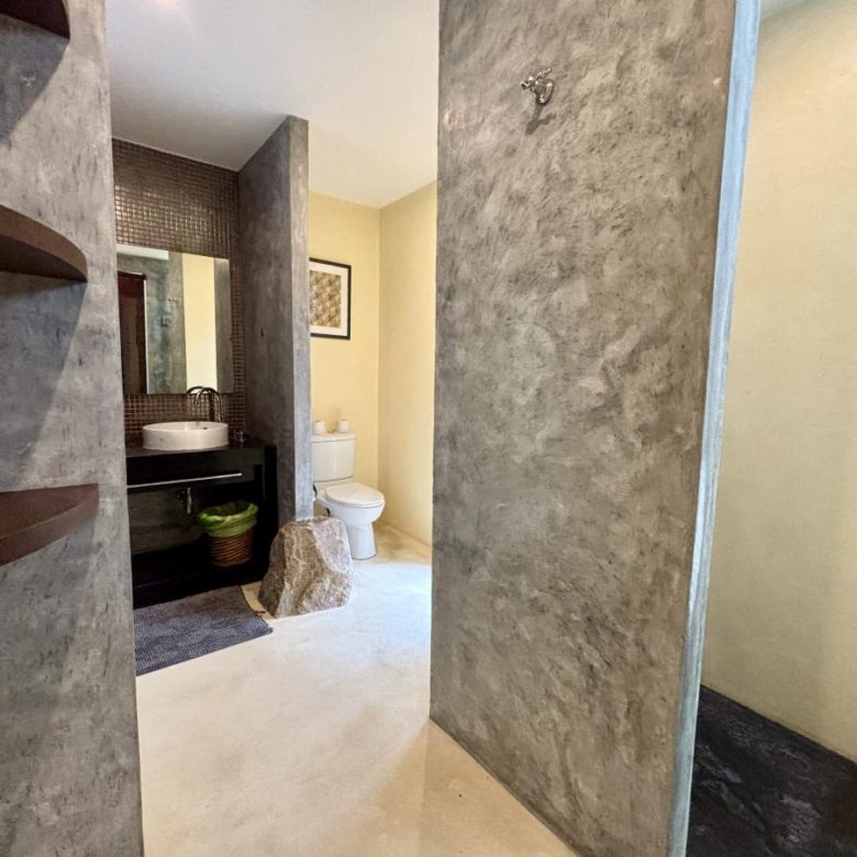 The first structure houses a spacious master bedroom, complete with built-in closet and en-suite bathroom, offering a serene retreat. Just across the pool, the second building unfolds into an inviting living space with an open-plan kitchen and guest toilet. A second bedroom with a separate bathroom completes this side of the property, creating a natural division that enhances privacy while maintaining connection.