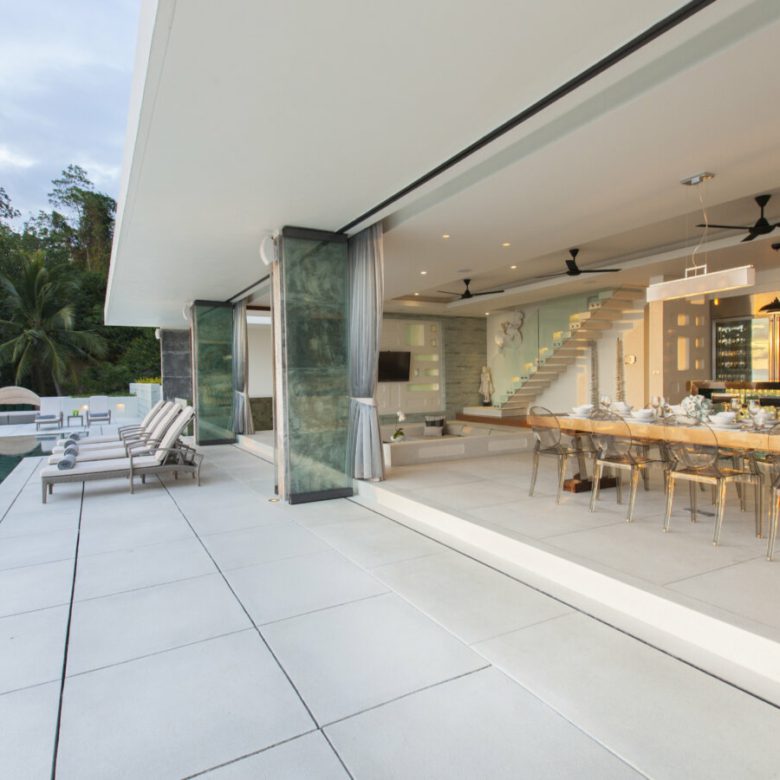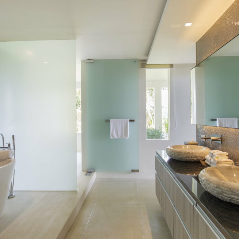 Your stay at this villa includes a complimentary airport transfer, as well as the services of a seasoned chef and a dedicated in-villa team of highly skilled professionals, ensuring a truly indulgent and once-in-a-lifetime experience. The main lounge and dining area, situated on the villa’s lower level, overlooks the pool and offers awe-inspiring views of the coastline and the offshore islands. Embodying the villa’s architectural style, the Great Room features a striking 60’s-style sunken sofa and a wall-mounted flat-screen TV.