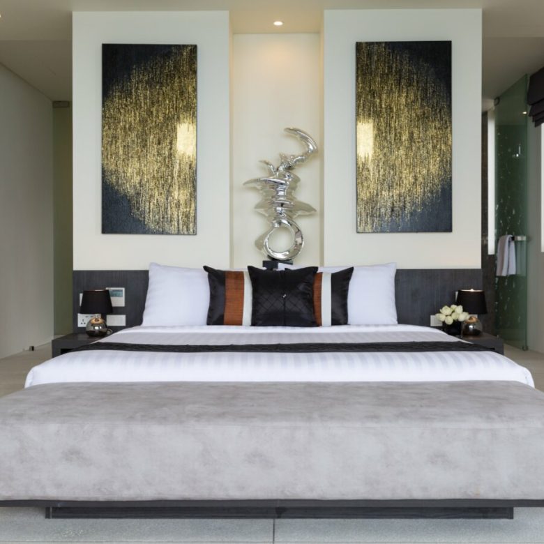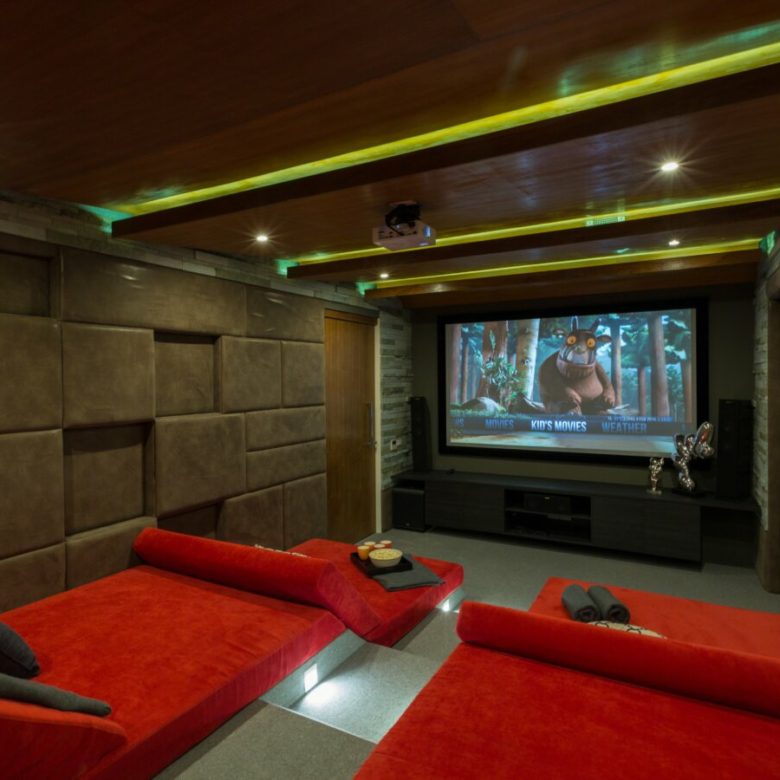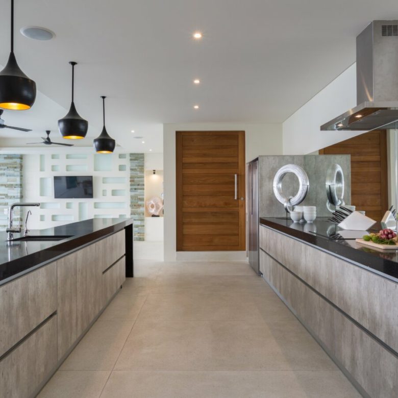 The villa’s communal living area seamlessly merges with the infinity pool and the surrounding terrace, offering a harmonious blend of indoor and outdoor living. Inside, a modern sunken lounge exudes comfort, while the dining space features a magnificent 12+seater dining table crafted from a single piece of exquisite acacia wood. Culinary delights are prepared in the ultra-modern kitchen, equipped with top-tier appliances and a sprawling granite breakfast bar. For added convenience, there’s a discreet second kitchen for staff use.