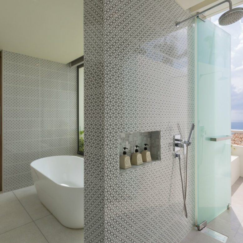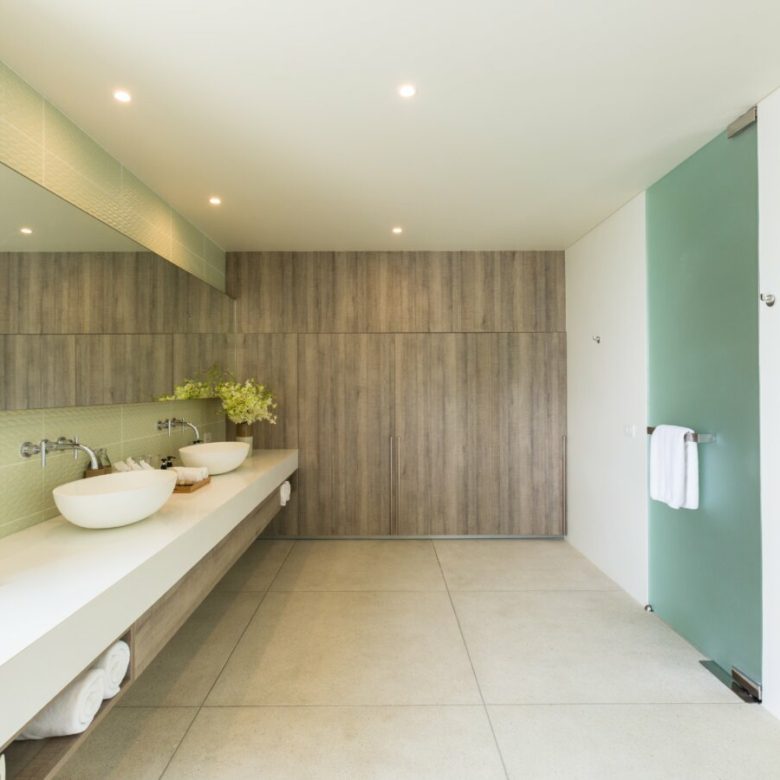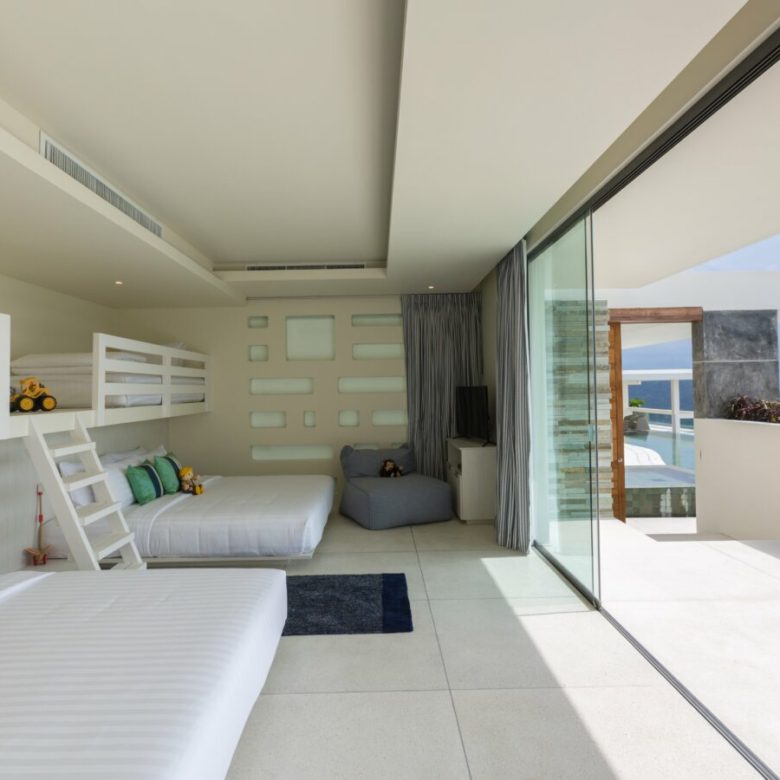 This villa can comfortably accommodate up to 16 guests, including children, in its five bedrooms, all equipped with HDTVs, generous wardrobes and en-suite bathrooms featuring walk-in glass rain showers. The master bathroom even boasts a sumptuous sea-view bathtub. The children’s bedroom cleverly accommodates two large beds for older kids, each attached to a single bunk, and offers a specially designed children’s bathroom with unique height-adjusted washbasins, a tub, a shower, and its own private walled outdoor terrace.