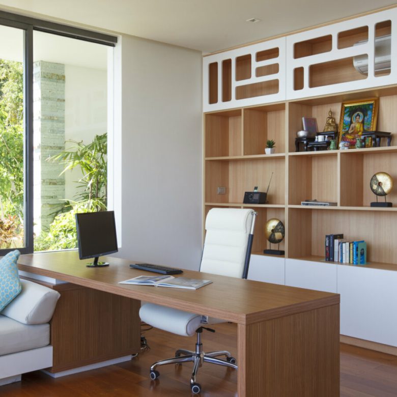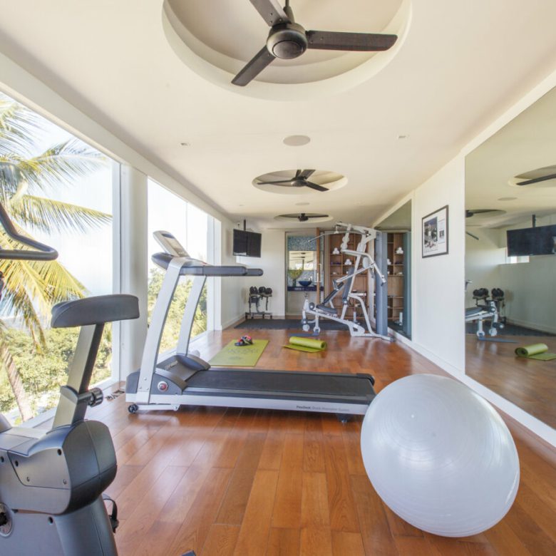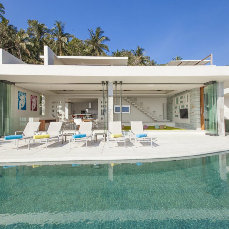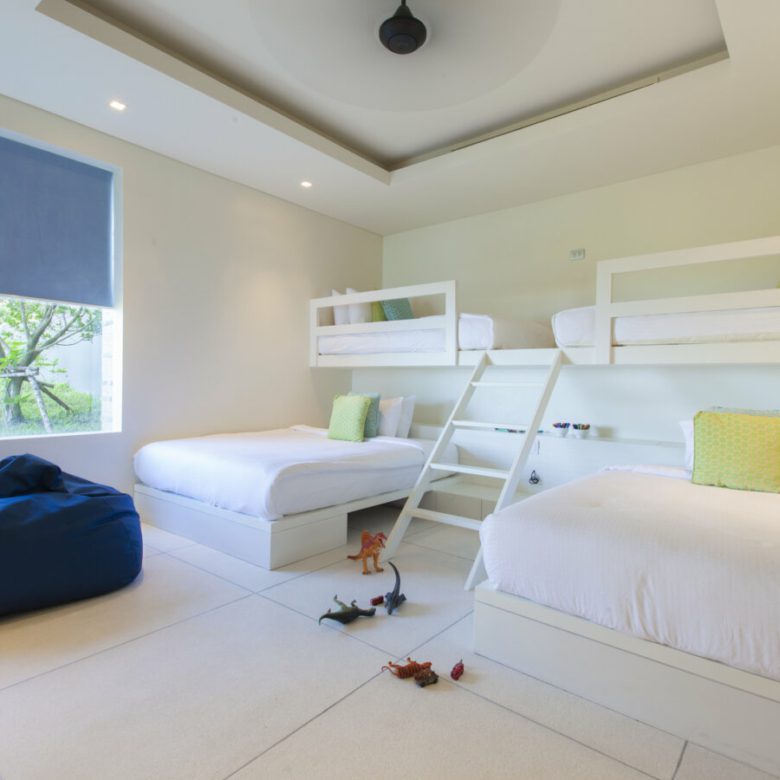 This villa is a grand private estate that spans three levels and boasts five spacious en-suite bedrooms, along with a remarkable total of eight bathrooms. It features a poolside relaxation sala, a dedicated spa area equipped with two massage beds and a pedicure chair, a fully equipped Life Fitness gym, a games room adorned with a striking ‘X-Men’ red pool table, a serene library/study with a sun deck seemingly floating on a reflective pond, and a deluxe private cinema equipped with a three-meter screen and plush reclining seating for 12-20 guests.