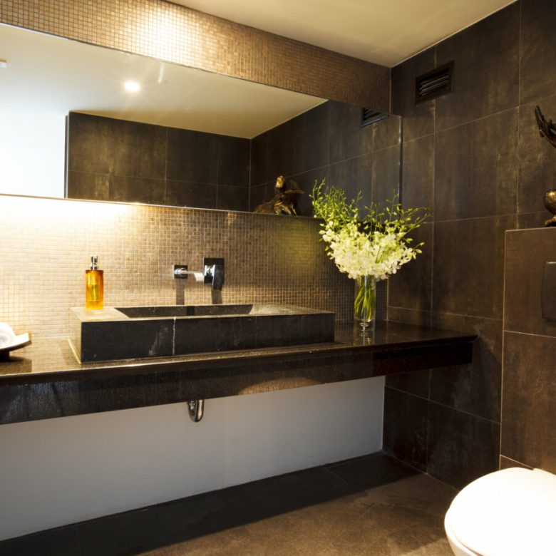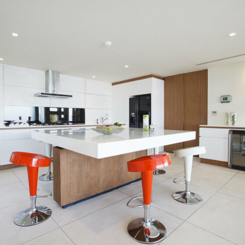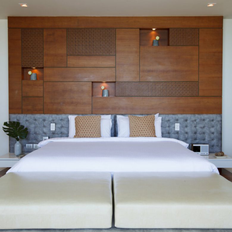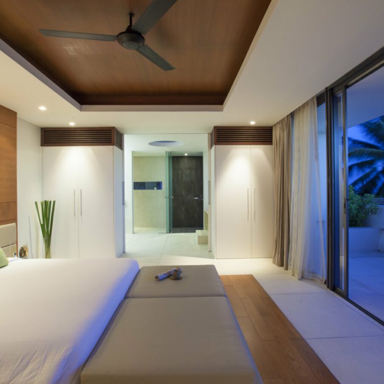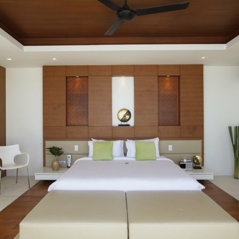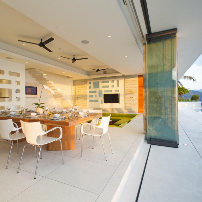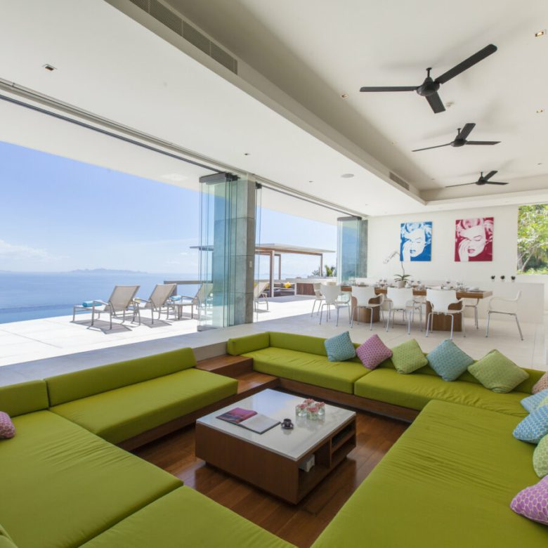 One of the villa’s standout features is its expansive LDR (Living, Dining, and Recreation) area that seamlessly connects to the pool deck. This area offers a sunken lounge with comfortable couches and an adjacent dining space with a 10-seater teak table and an elegant polished white Corian bar, all complemented by a fully equipped Western kitchen. The high-end frameless floor-to-ceiling glass doors provide uninterrupted views of the spectacular surroundings, allowing guests to enjoy the vistas in any weather conditions, day or night. Whether opting for the refreshing sea breeze or relying on air conditioning, this space offers a comfortable living environment.