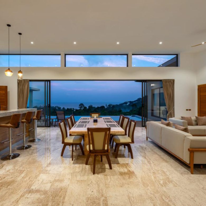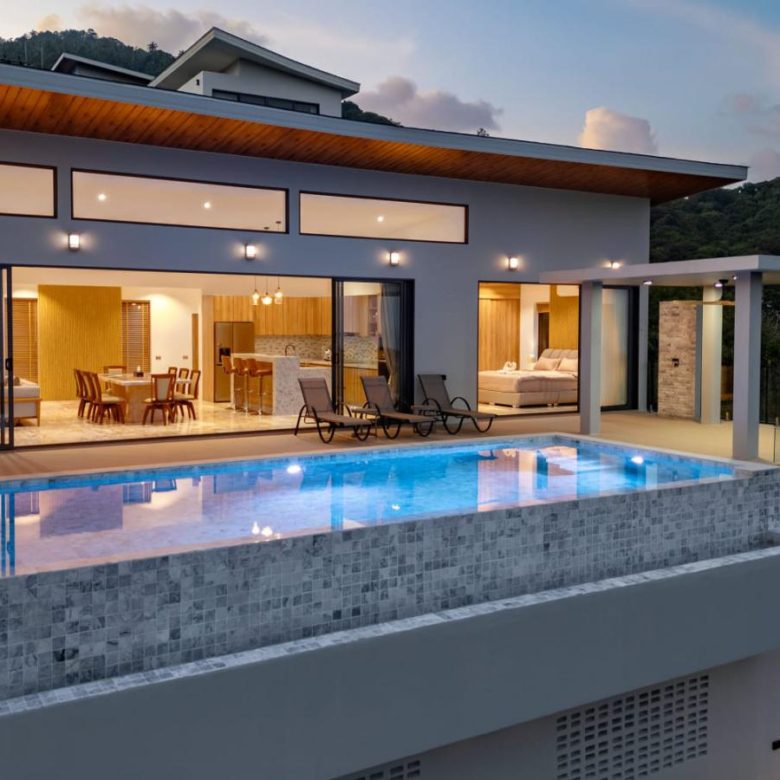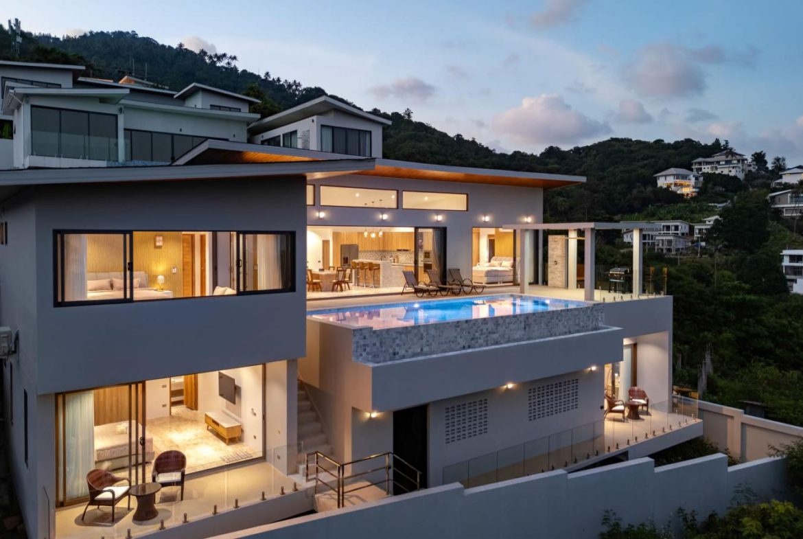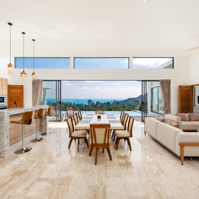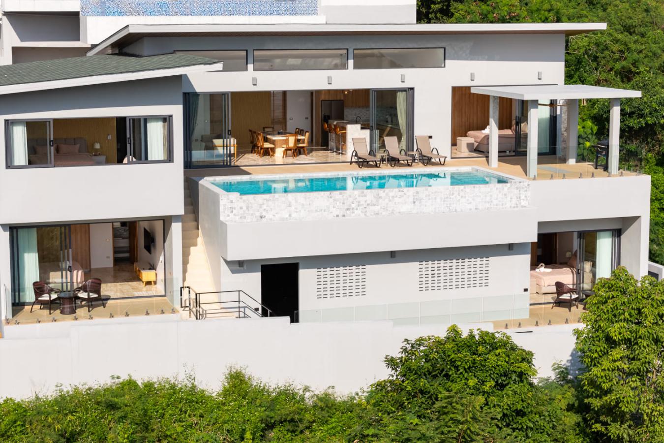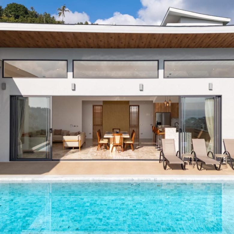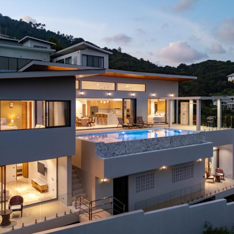 Enjoy panoramic views over the ocean and Chaweng Lake from this striking contemporary villa, perfectly positioned to combine elevated privacy with exceptional convenience. Designed with modern materials and clean architectural lines, the property offers generous indoor and outdoor living spaces framed by sweeping island views.