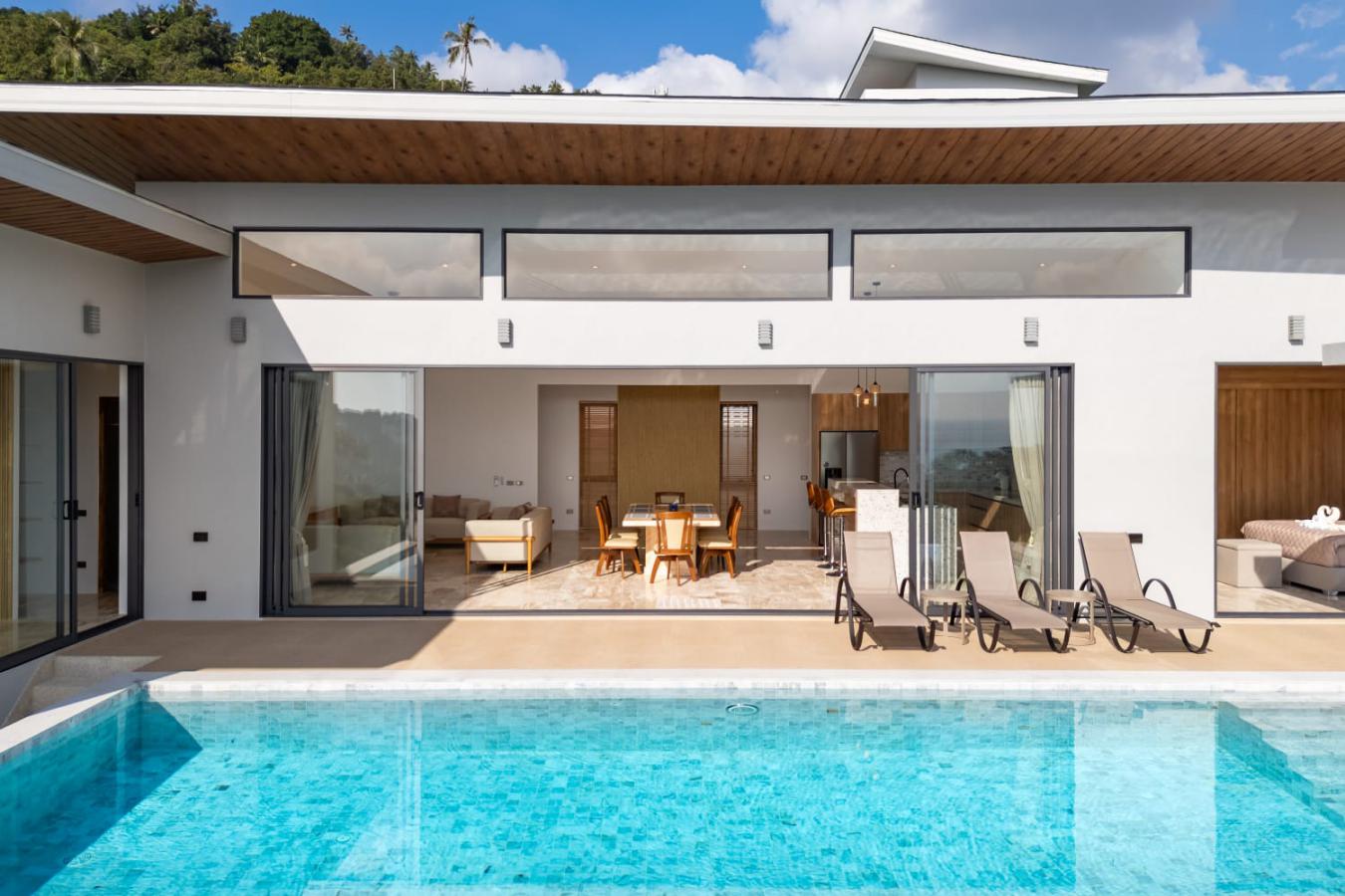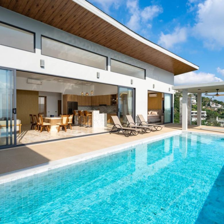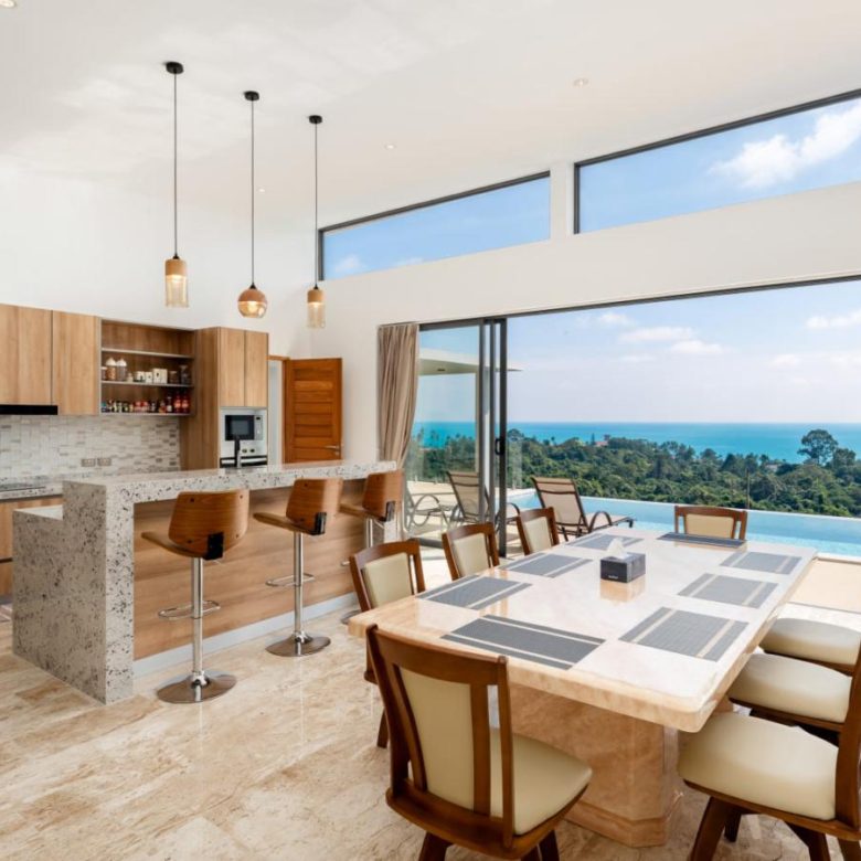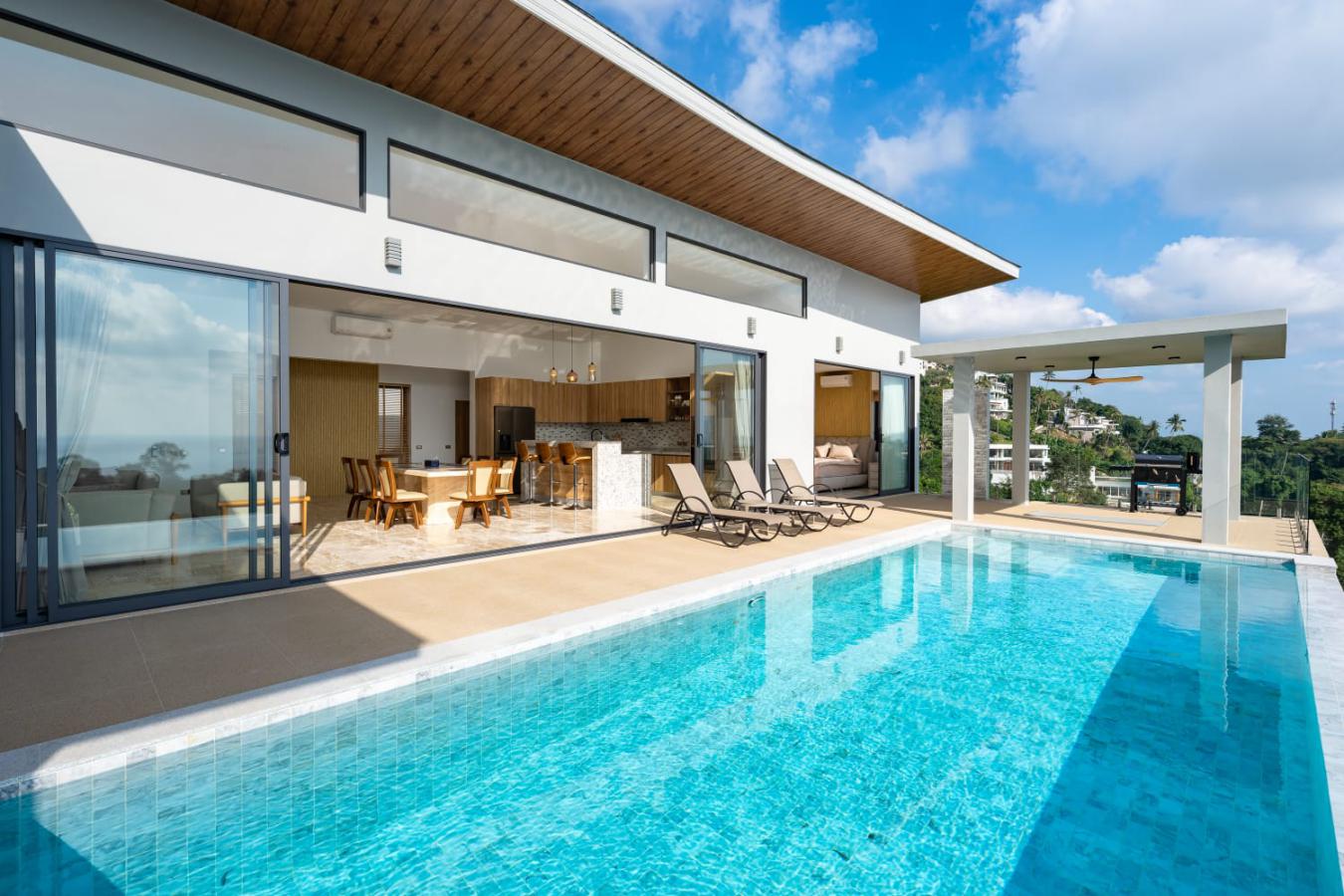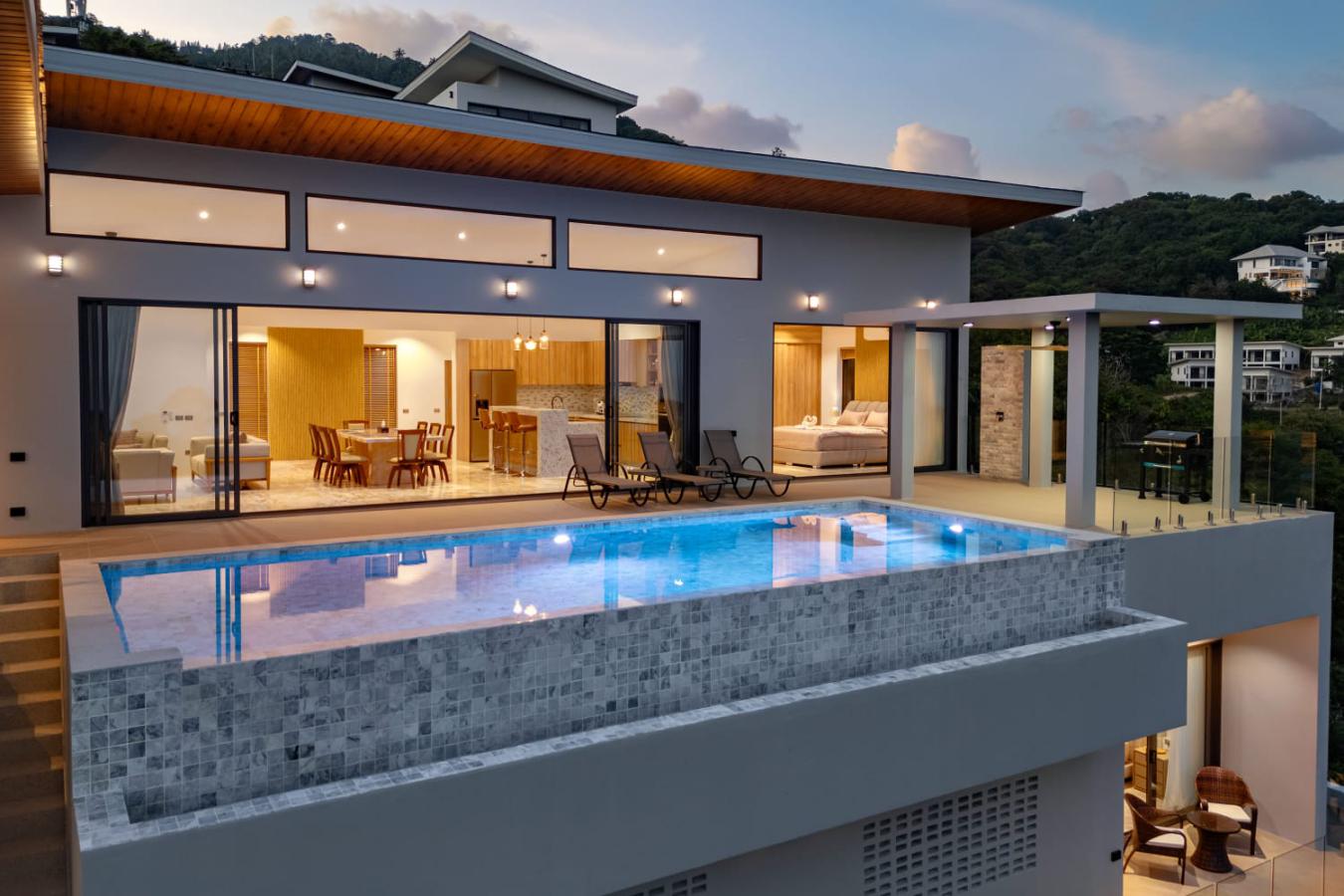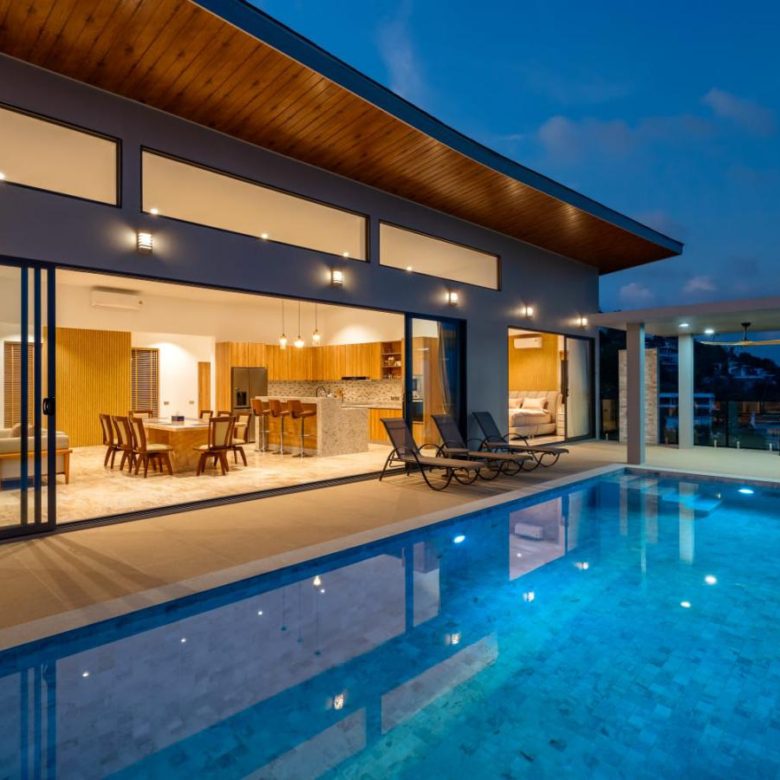 Enjoy panoramic views over the ocean and Chaweng Lake from this striking contemporary villa, perfectly positioned to combine elevated privacy with exceptional convenience. Designed with modern materials and clean architectural lines, the property offers generous indoor and outdoor living spaces framed by sweeping island views.