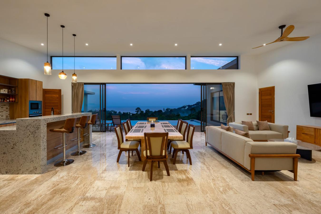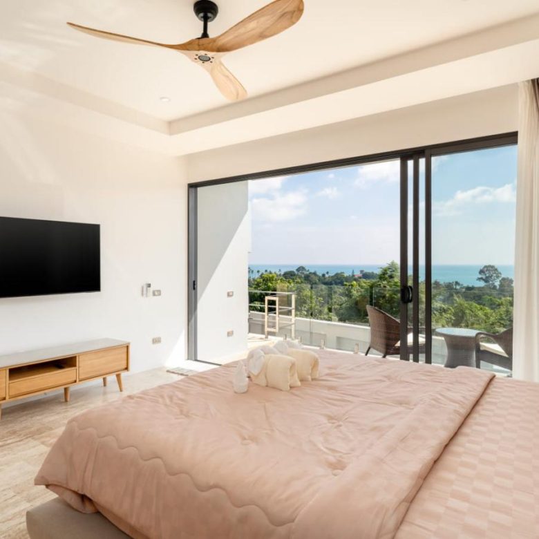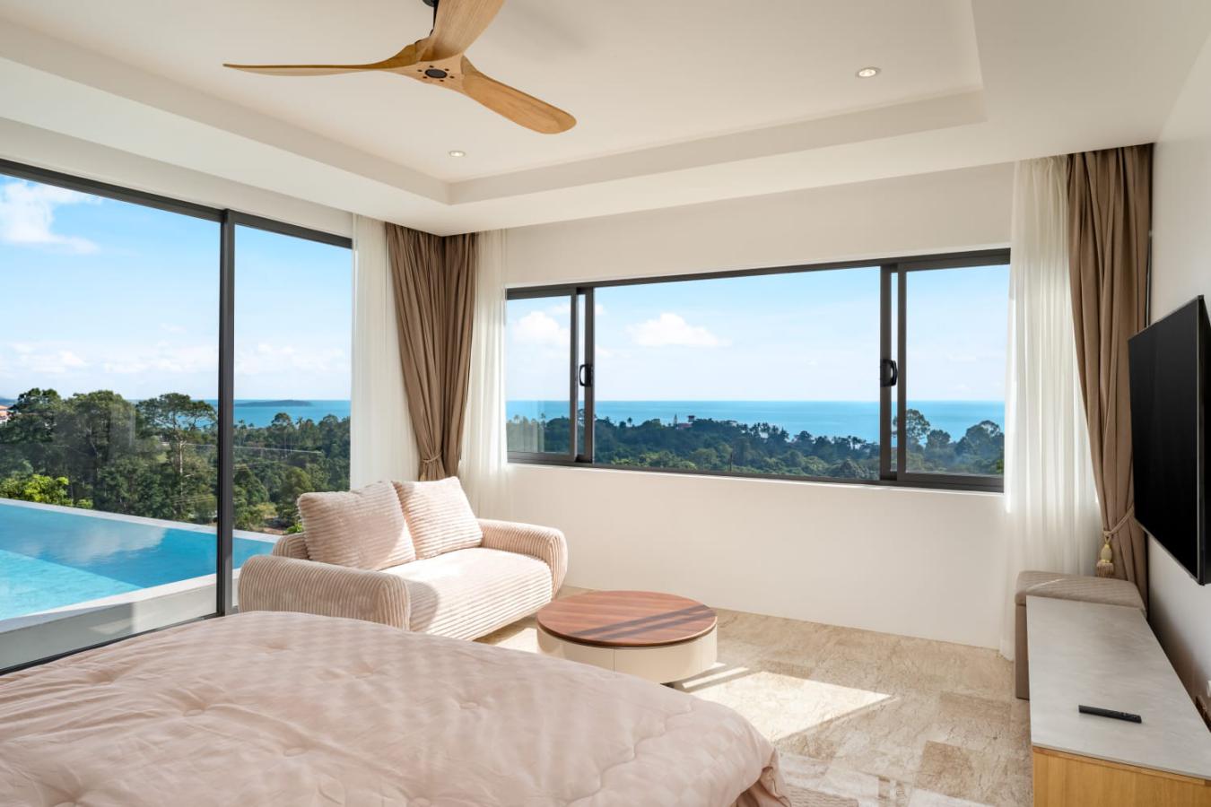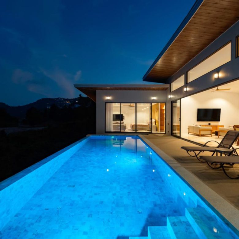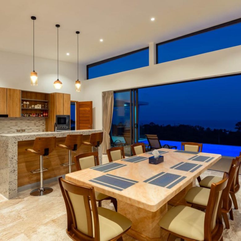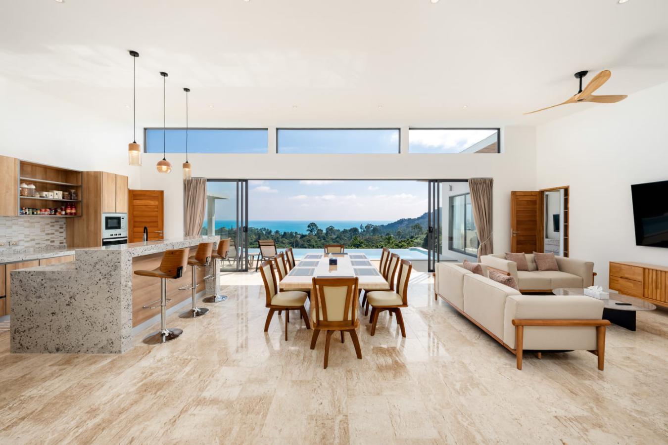 Enjoy panoramic views over the ocean and Chaweng Lake from this striking contemporary villa, perfectly positioned to combine elevated privacy with exceptional convenience. Designed with modern materials and clean architectural lines, the property offers generous indoor and outdoor living spaces framed by sweeping island views.