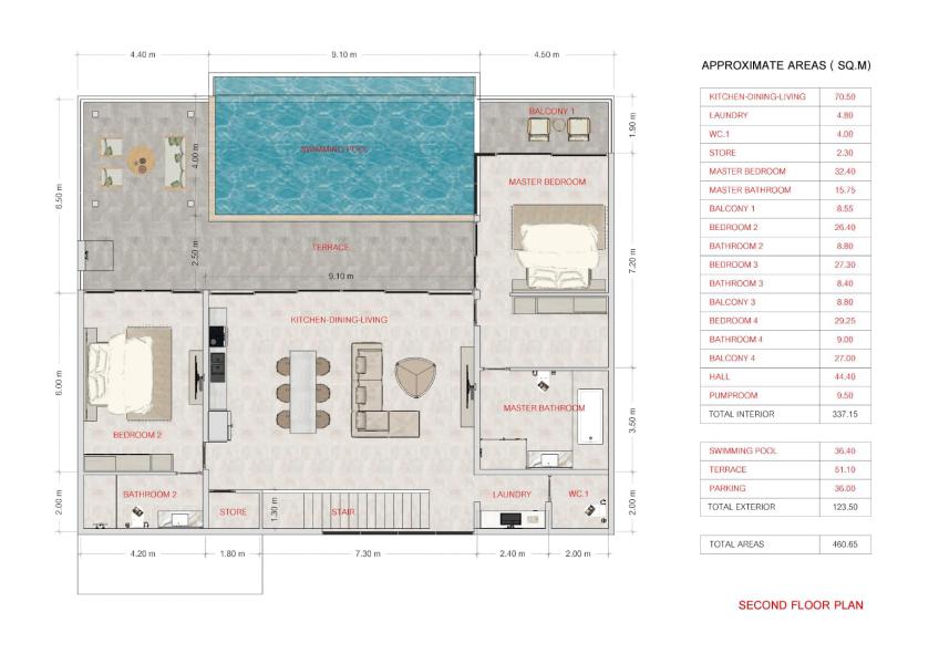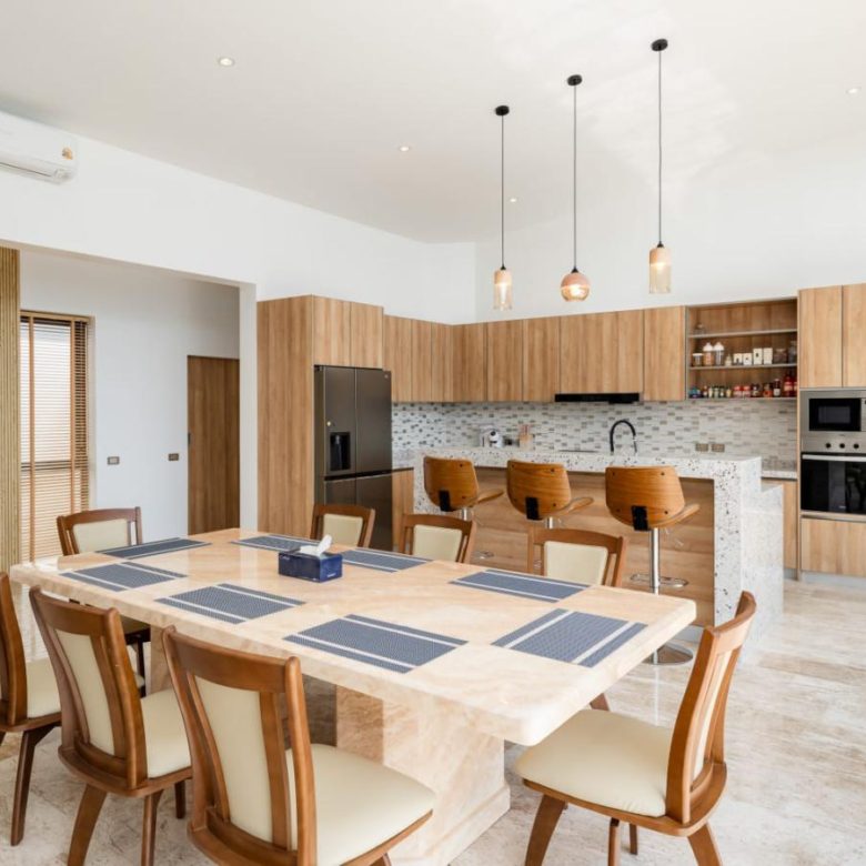 Set on a 700 sqm land plot with approximately 460 sqm of living area, the villa features four spacious bedrooms and five bathrooms, each designed to maximize comfort and functionality. The open plan living and dining areas connect seamlessly to the outdoors, while large openings invite natural light and cooling breezes throughout the home.
