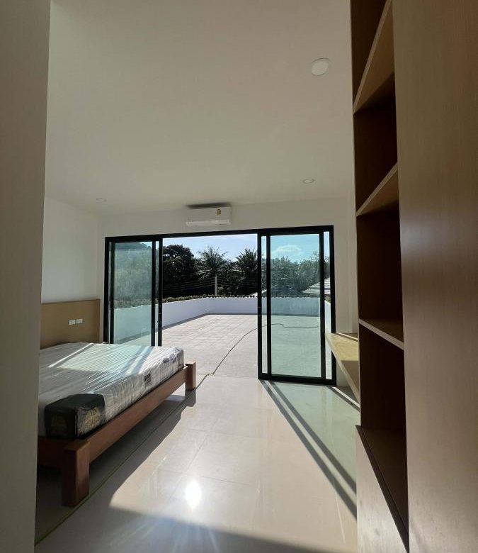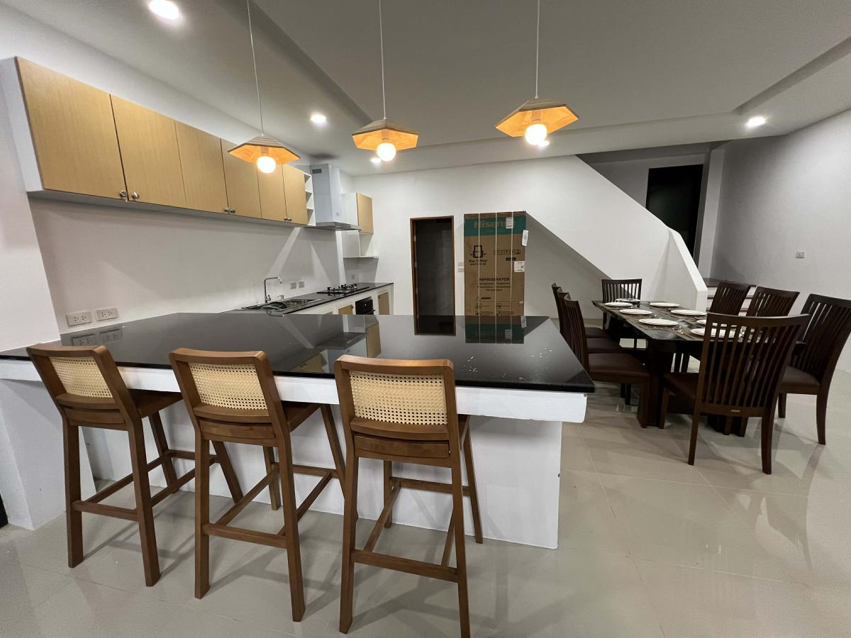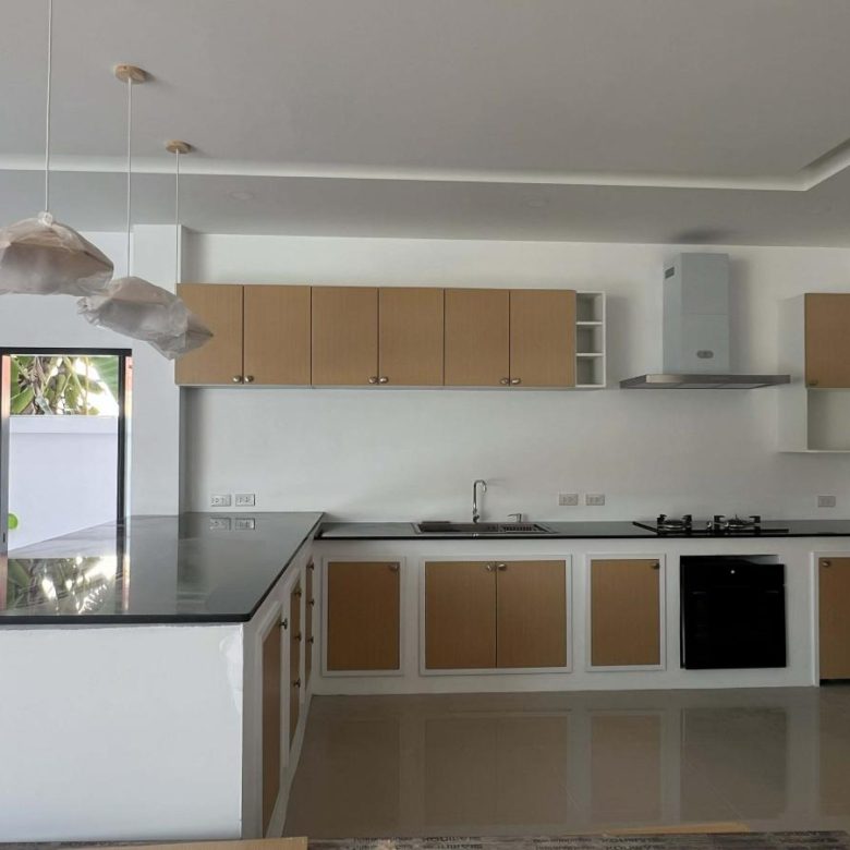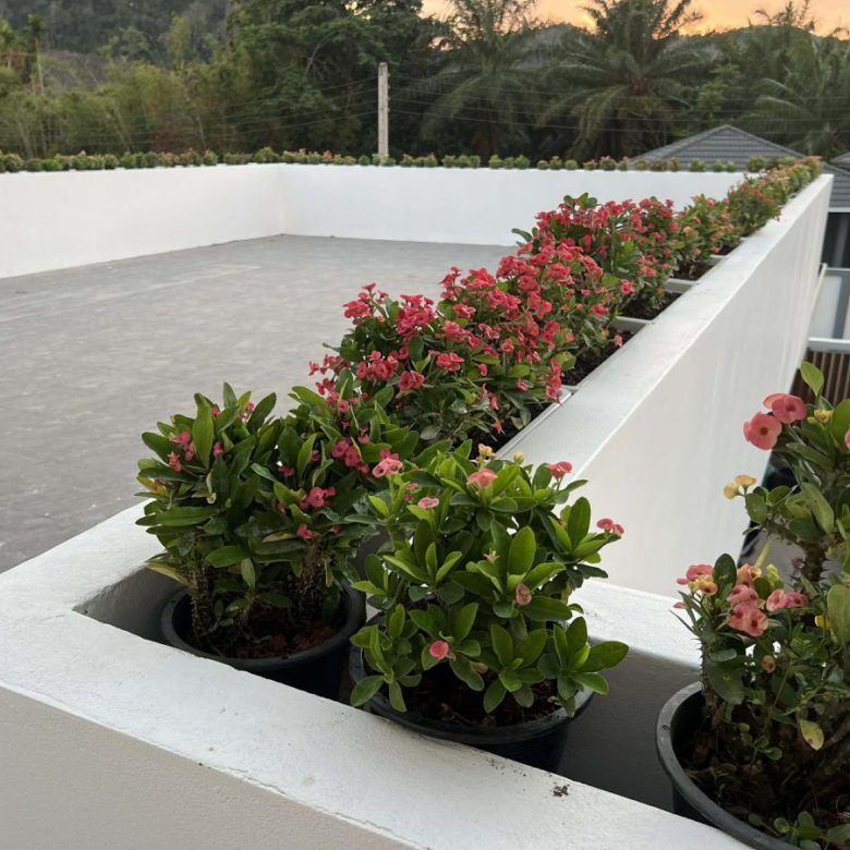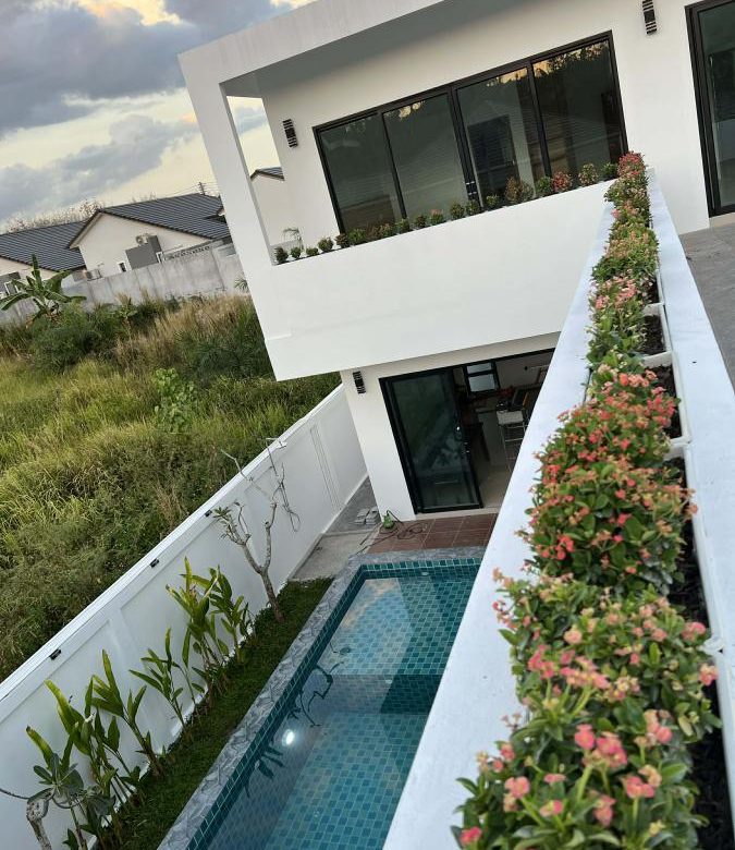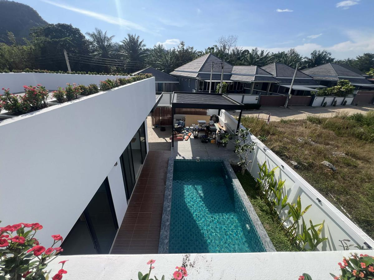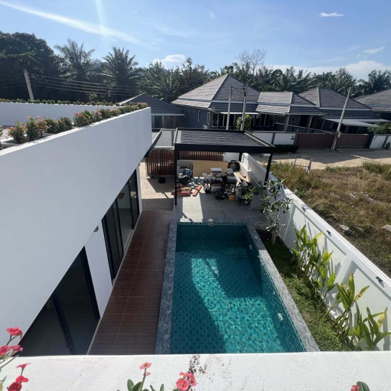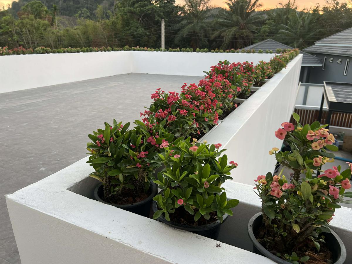 This pool villa features a spacious living room, 4 bedrooms, and 5 bathrooms. The kitchen boasts granite countertops and brand-name appliances. There’s a spacious dining room and a bright living room with a real leather sofa set and dining chairs. The surrounding area offers a full range of amenities, including supermarkets, schools, an international hospital, and local markets. The villa is located in a golden area with a peaceful and healthy community, 5 minutes’ driving time to Ao Nang Beach. This villa has a sky garden on the second floor with a surrounding mountain view.