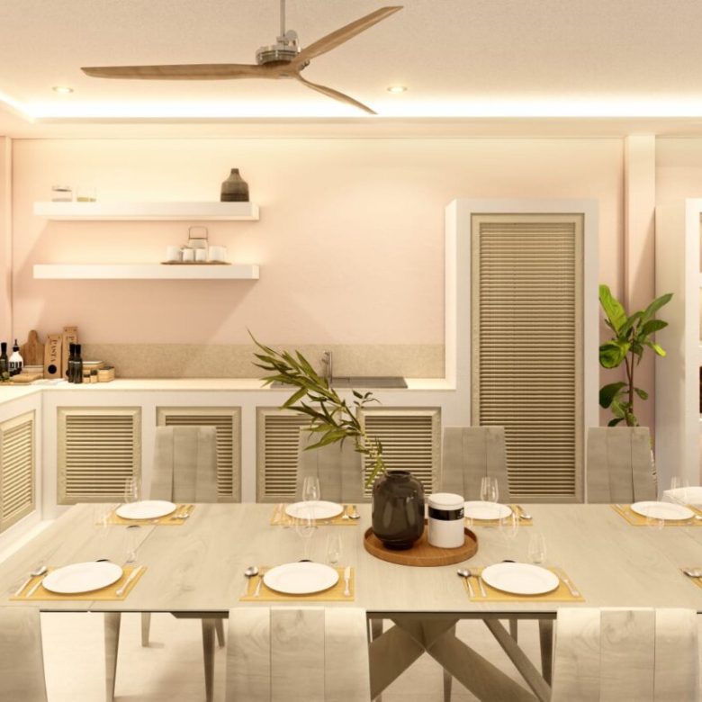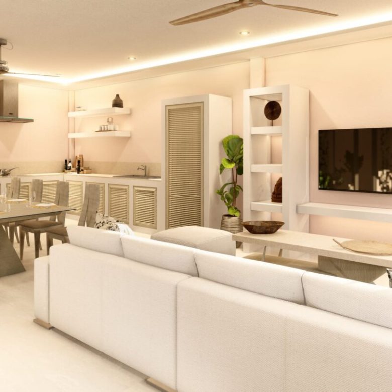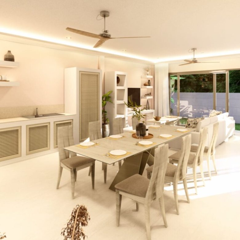The villa has 2 bedrooms with 2 bathrooms. The living room is connected to the kitchen and has a European kitchen style. If you go out onto the covered terrace you have a pool of 7 meters by 3 meters in front of you which invites you to swim.