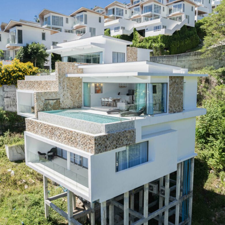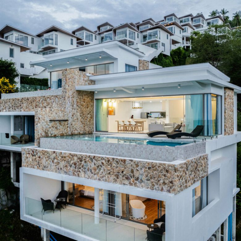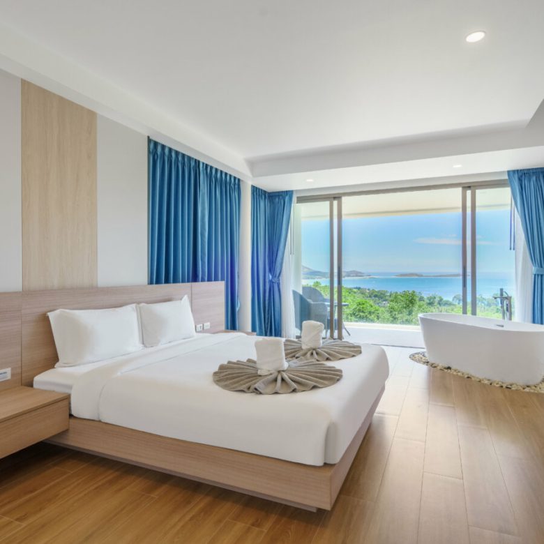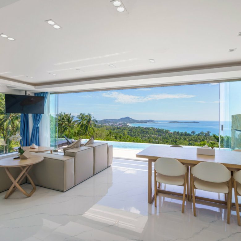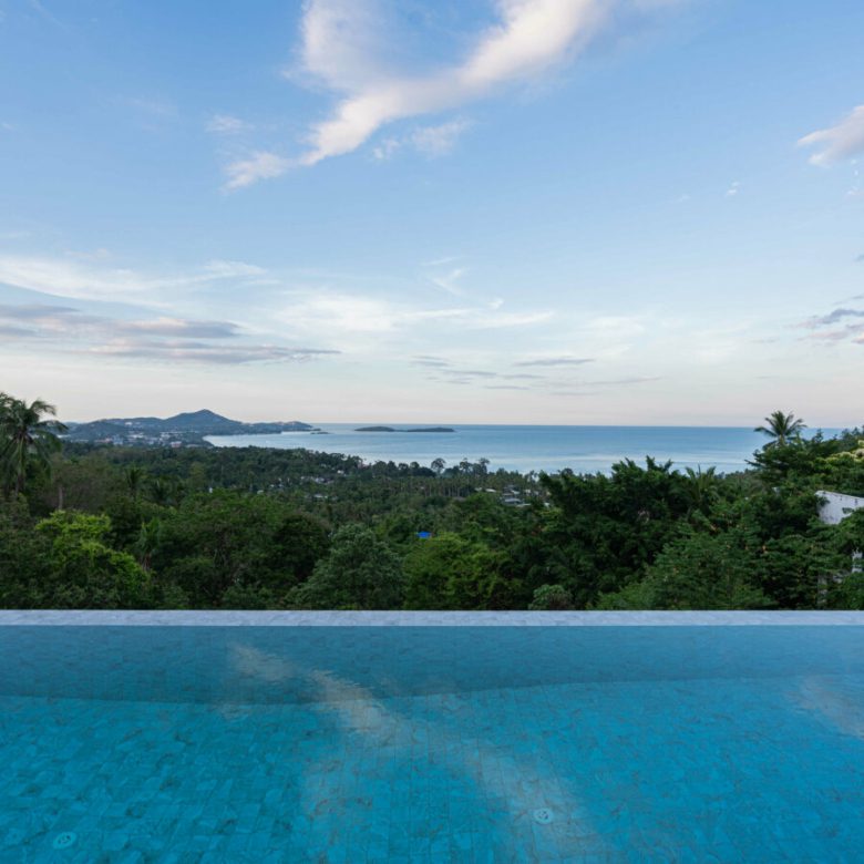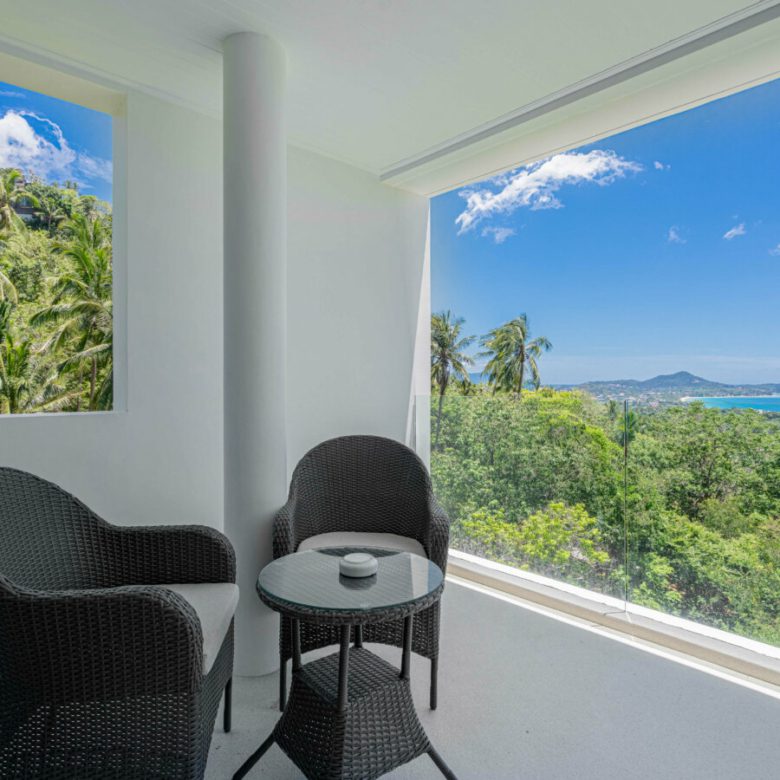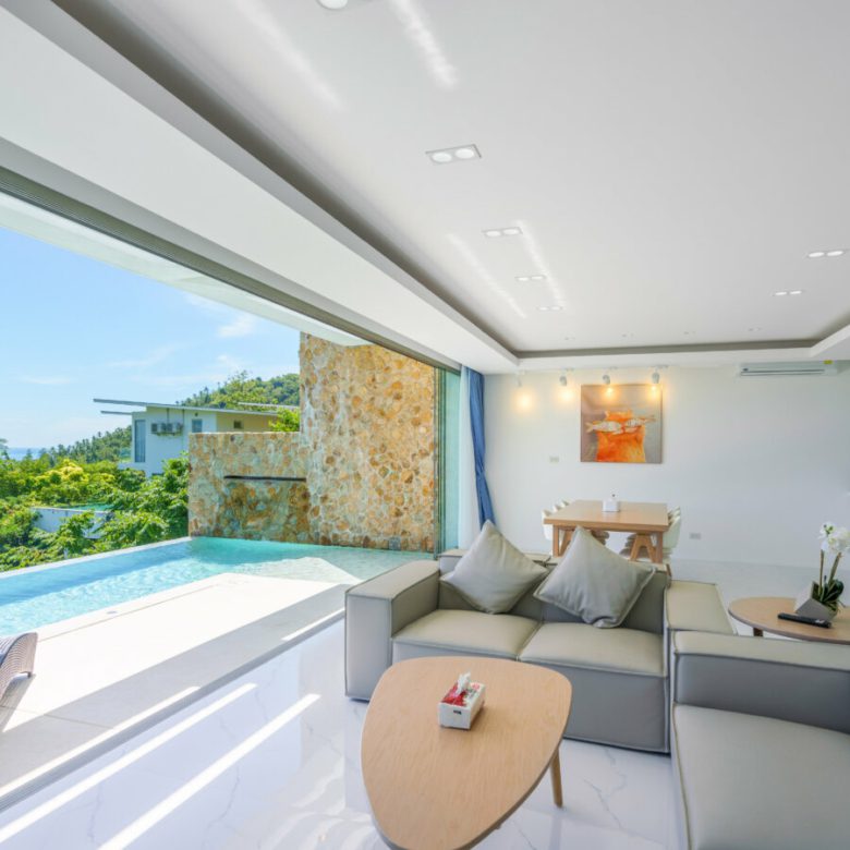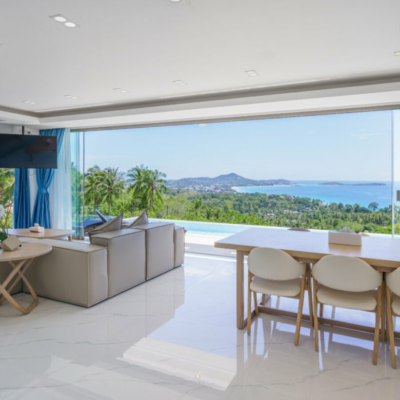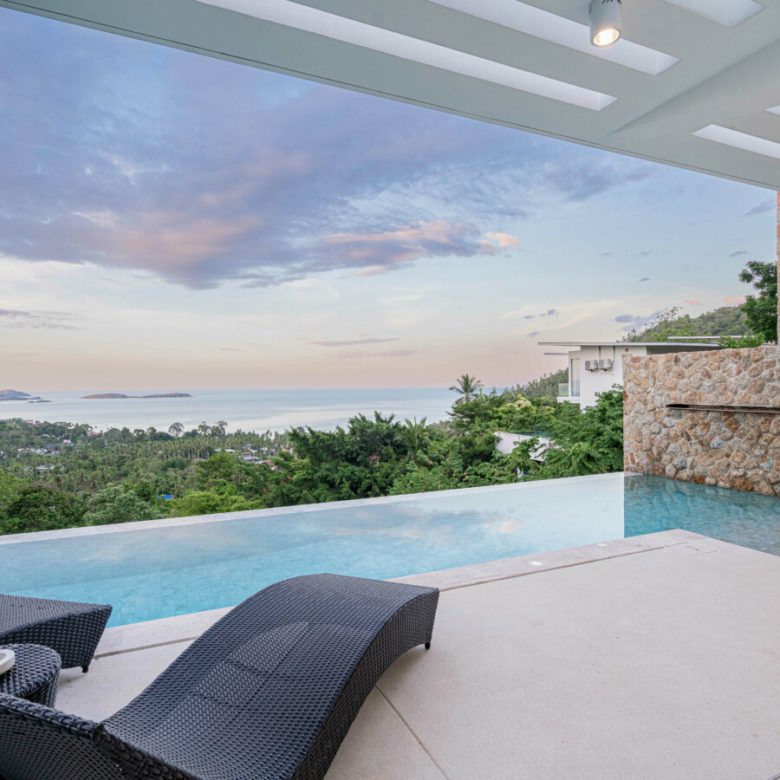This gorgeous semi-detached three bedroom villa captured one of the most outstanding views in the east of the island . Located in a community 5 minutes drive from Chaweng Beach , this brand new villa completed in 2023. Features two spacious Seaview bedrooms with stunning Seaviews and a kids bedroom with bunk beds.
