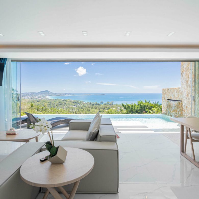The living room area on the upper level offers sweeping Seaviews and views of Koh Matlang , Chaweng beach and the gulf of Thailand . A gorgeous infinite pool offer a great relaxation on the Terrance .