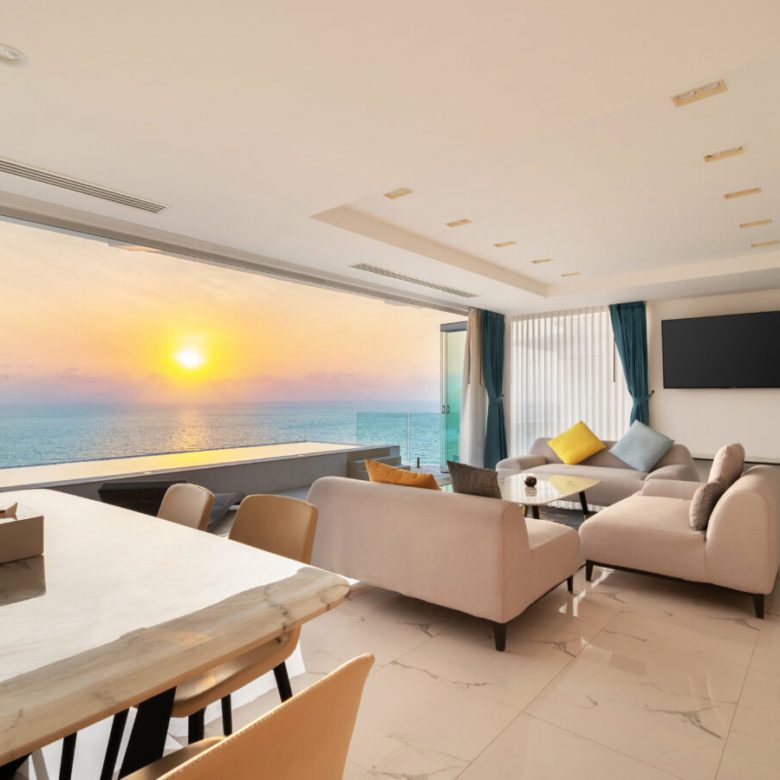 This modern home is sold fully furnished and was completed in 2011 and offers spectacular Seaviews and is built on three levels.