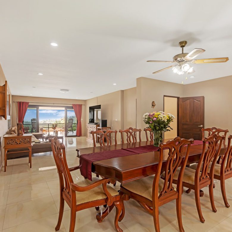 - Dining room with cherry wood table and 80″ flat screen smart TV
