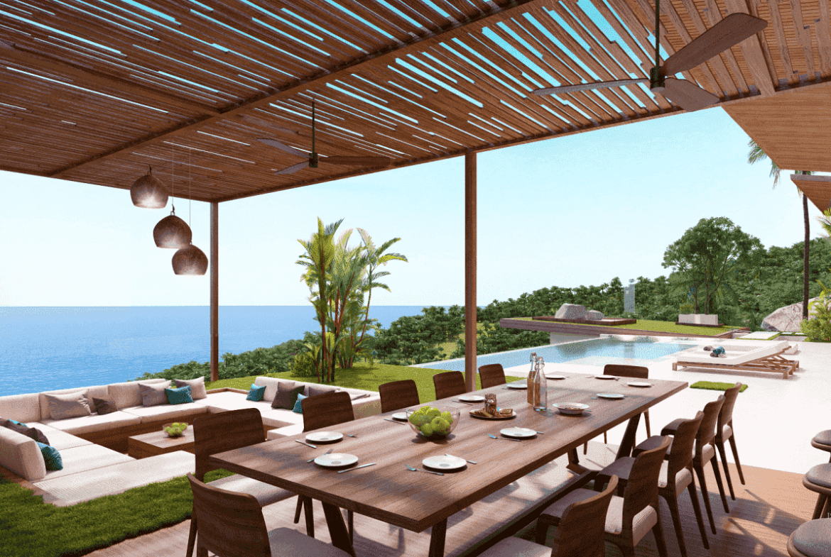 A beautiful villa, among a landscaped and secluded garden and offers a breathtaking sea view. It’s a modern design villa with 5 bedrooms, including one master with an en-suite bathroom. A striking entrance leads to a sizable outdoor area with a sala (exterior covered lounge). The villa includes a TV lounge, a dining room, and an open-plan kitchen overlooking the infinity pool.