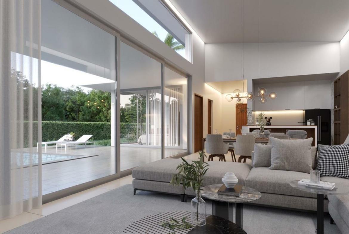 This will be the ideal holiday and residential villa, spacious inside with an open plan living area, dining area, and fully equipped fitted kitchen with breakfast bar. The ceiling will be high allowing for good air circulation and well lit with the floor-to-ceiling glass doors that provide views and access to the partially covered large terrace and 58 Sqm swimming pool.