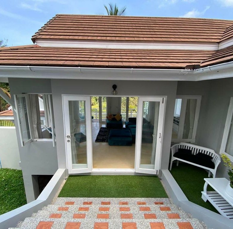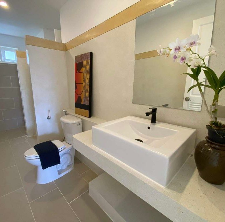 The villa is easily accessed by a concrete road, and has a carport at the front for two cars, an external staircase and inviting French doors at the bottom that flows into a bright open plan living room and dining area with natural light, a kitchen, with a panoramic view of the lush green mountains dotted with coconut trees in the distance creating a peaceful, serene, calming homecoming. All three bedrooms on this level are sensibly built with a wrap-around terrace that boasts stunning uninterrupted views from each bedroom.