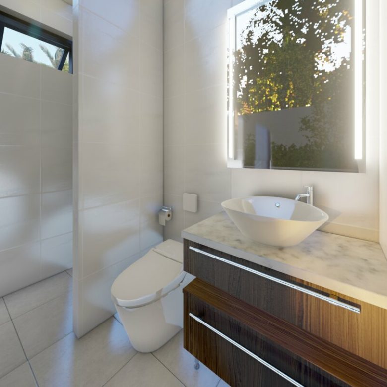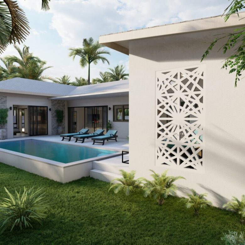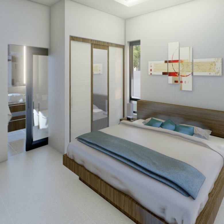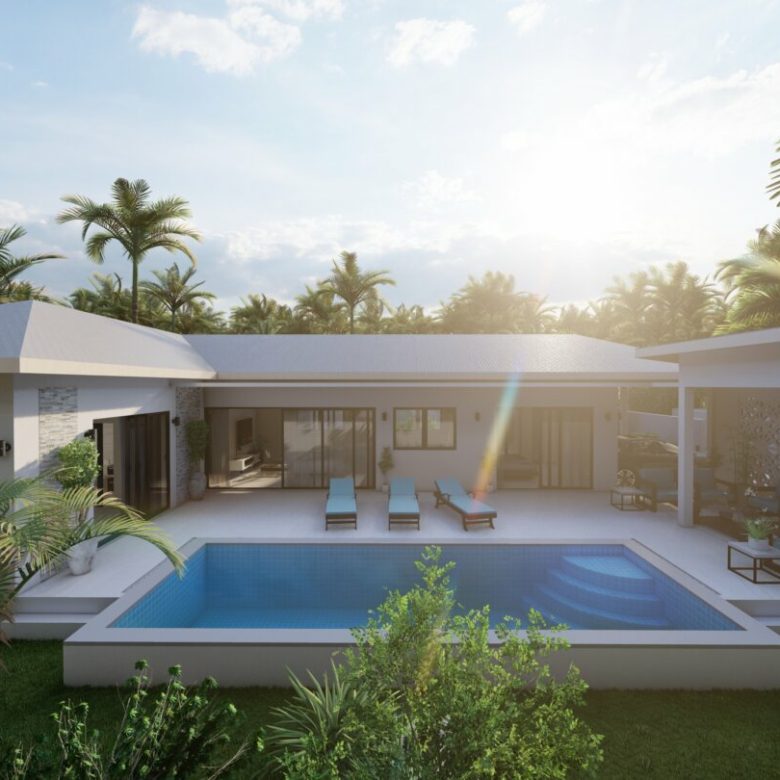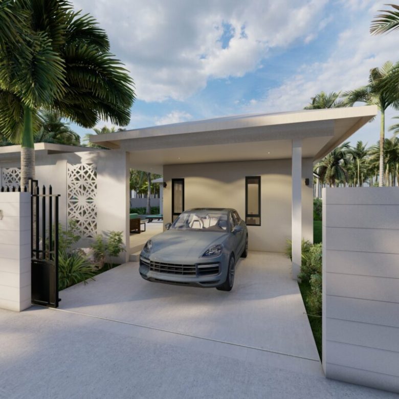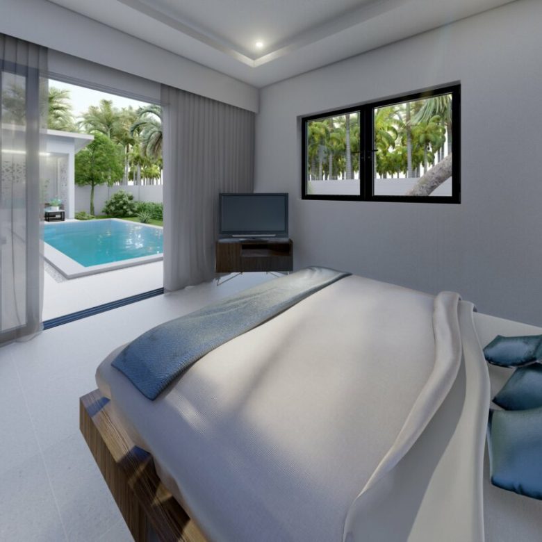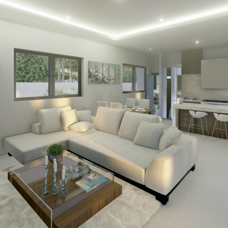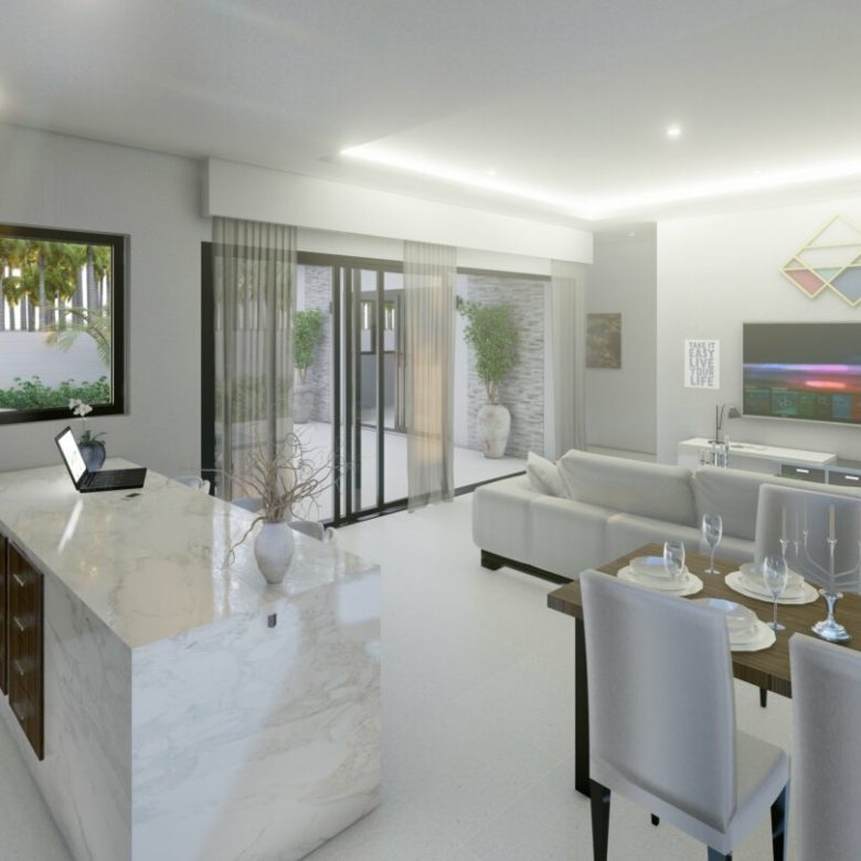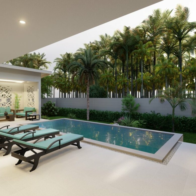 6 modern villas with 3 bedrooms and 3 bathrooms each having living room, kitchen, 50sqm covered terrace, 8m x 3m swimming pool, covered parking area and a 20 sqm pool house that can be turned into a bedroom or an office if needed.