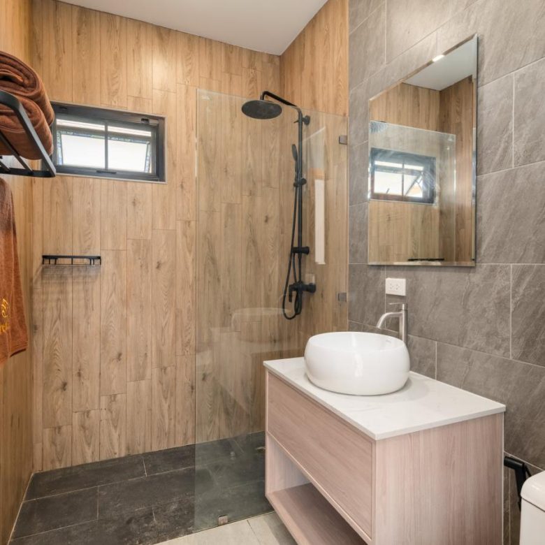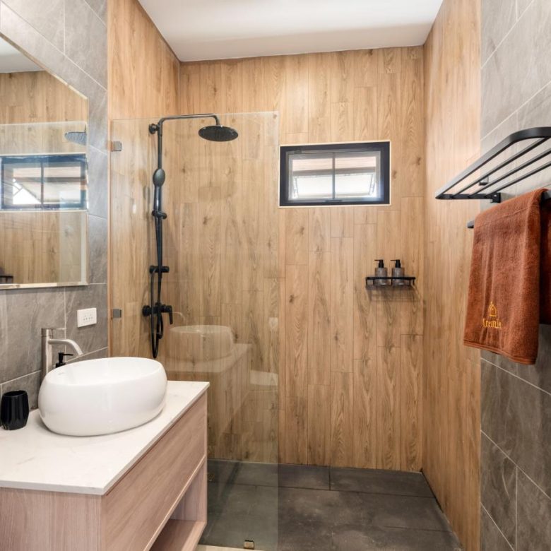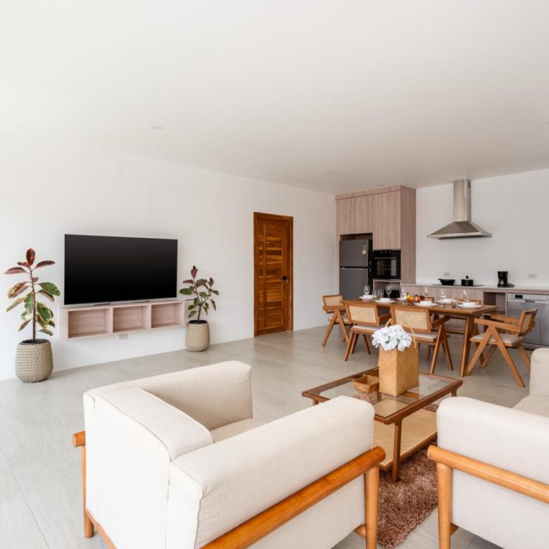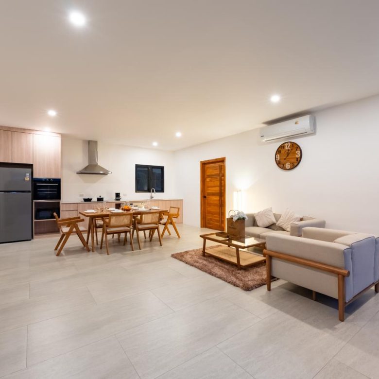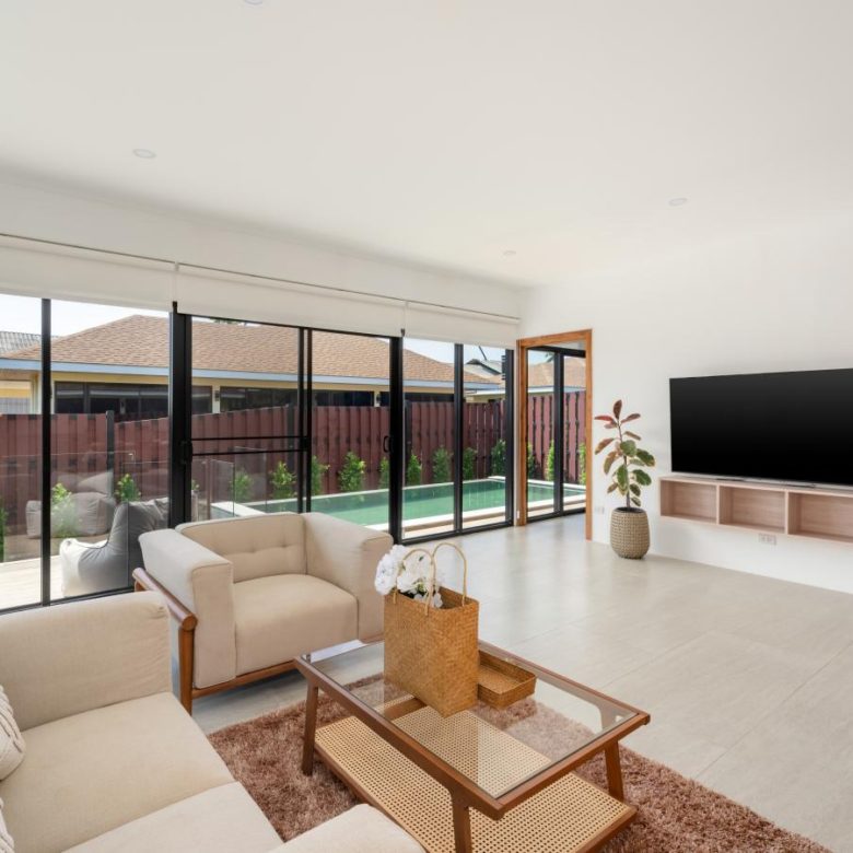Walking through the front door, you are immediately welcomed by a bright, open-plan living area with floor-to-ceiling sliding doors that lead onto your private sun terraces and swimming pool, seamlessly connecting indoor and outdoor living. The modern tropical design includes teak interior doors, ceramic finishes, and elegant pool ceramics, creating a home that is both stylish and practical.