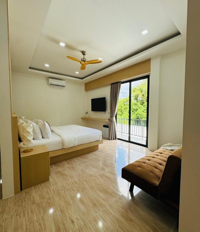 âĒ Master Suite: Spacious master bedroom with an 8-meter-long closet, sitting area with a sleeper sofa (accommodates two small children), ceiling fan, and a 55-inch HD TV