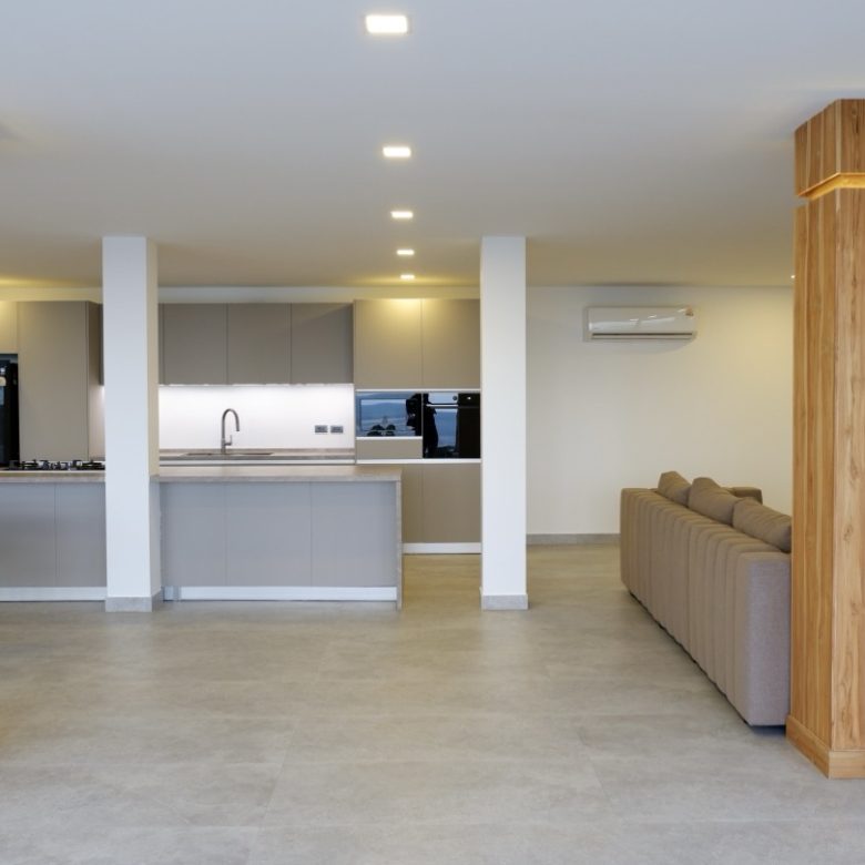 The upper level operates as a fully self-contained villa, featuring four en-suite bedrooms, a spacious open-plan living, dining, and kitchen area, and expansive terraces that open directly onto a 12 x 4 meter swimming pool. Designed to take advantage of its elevated position and sea views, this level provides approximately 414 square meters of developed space, creating a bright and inviting setting for entertaining or holiday living.