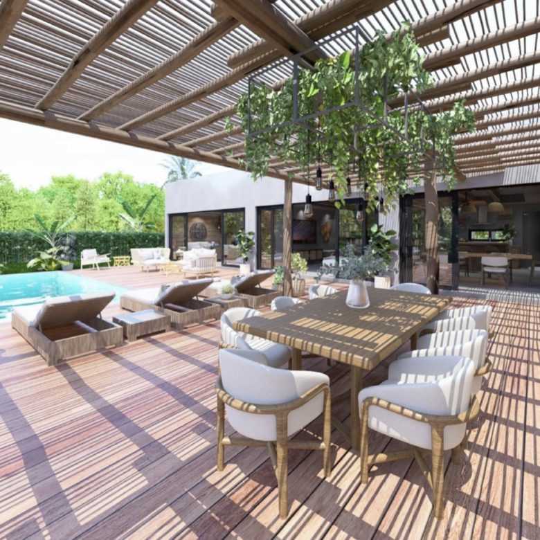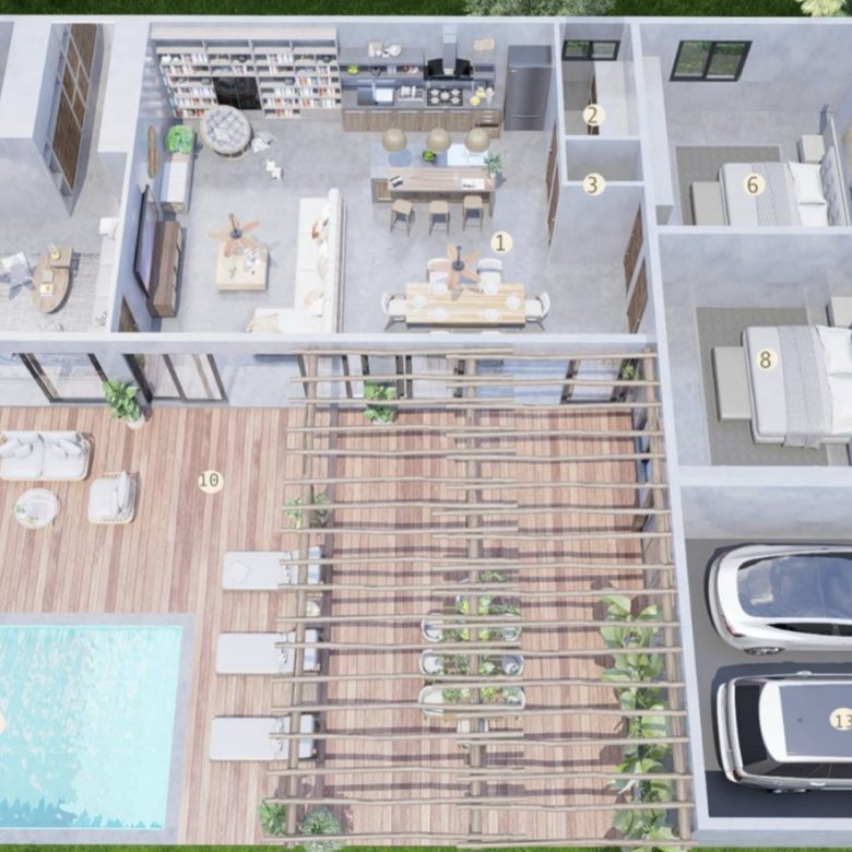 The single storey layout is designed for ease and space, with a large open living and dining area flowing into a fully equipped kitchen. The master suite includes its own bathroom, while two additional bedrooms each come with en-suite facilities, ensuring privacy and convenience for family and guests. Wide glass doors connect the interiors to a covered terrace, an infinity pool measuring 3.5 × 7.5 m, and landscaped gardens. A car park for two vehicles completes the property.