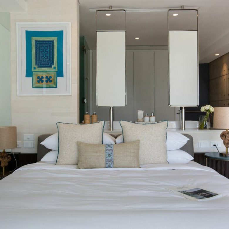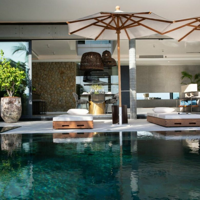 The fully-equipped luxury kitchen and dining room features imported European furnishings and appliances and accordion doors opening onto a large terrace with oak lounge furniture and an infinity swimming pool overlooking the sea with views of the famed Big Buddha to the south. Delicate sculptures and Bohemian-inspired art pieces accent the airy modern design.