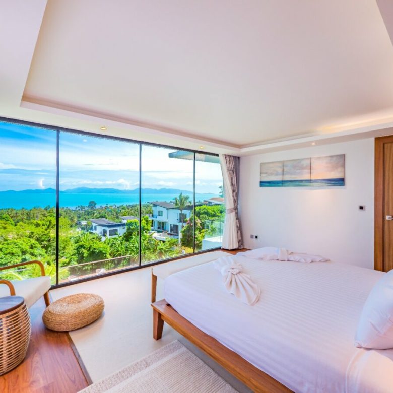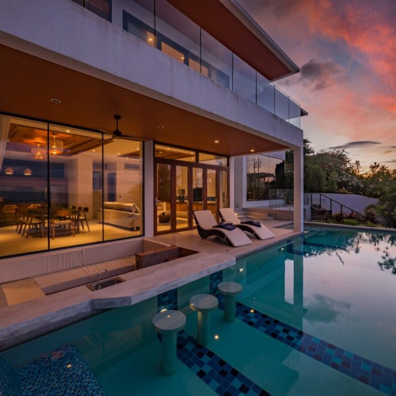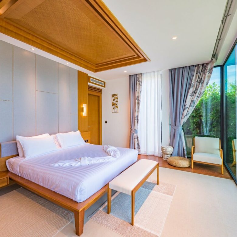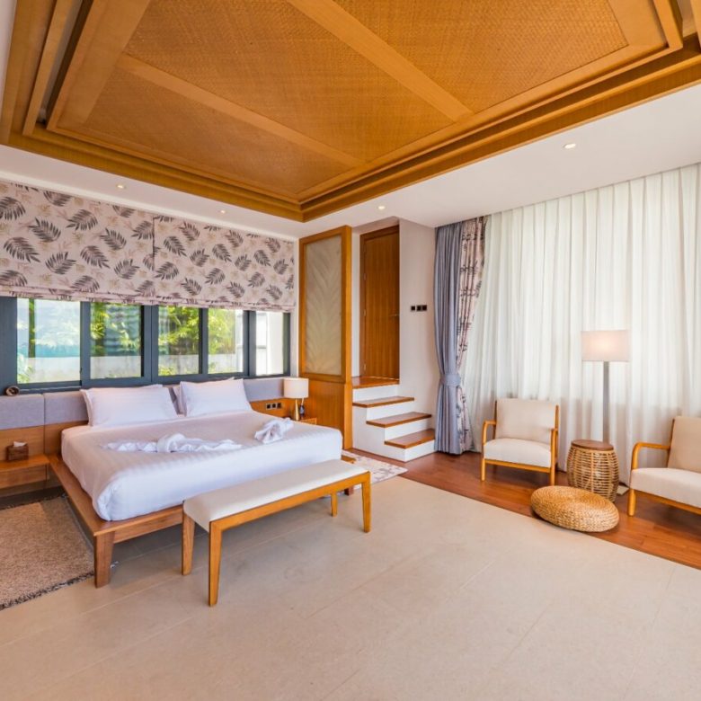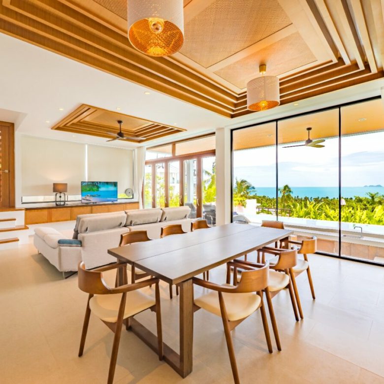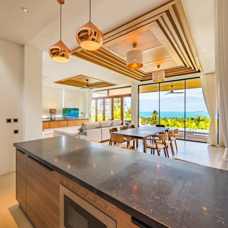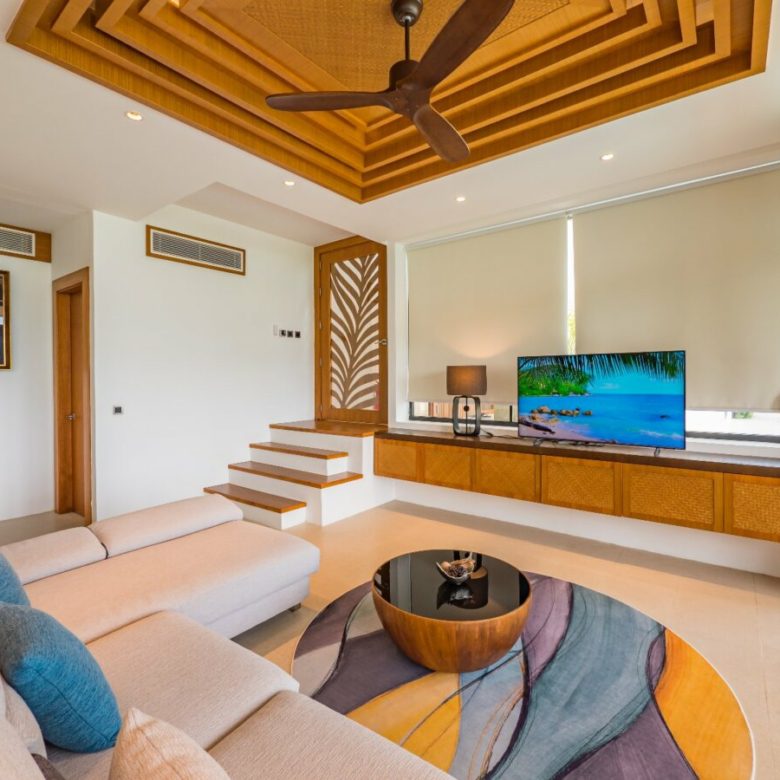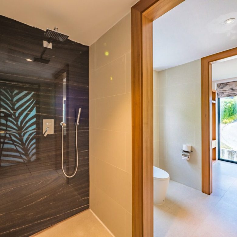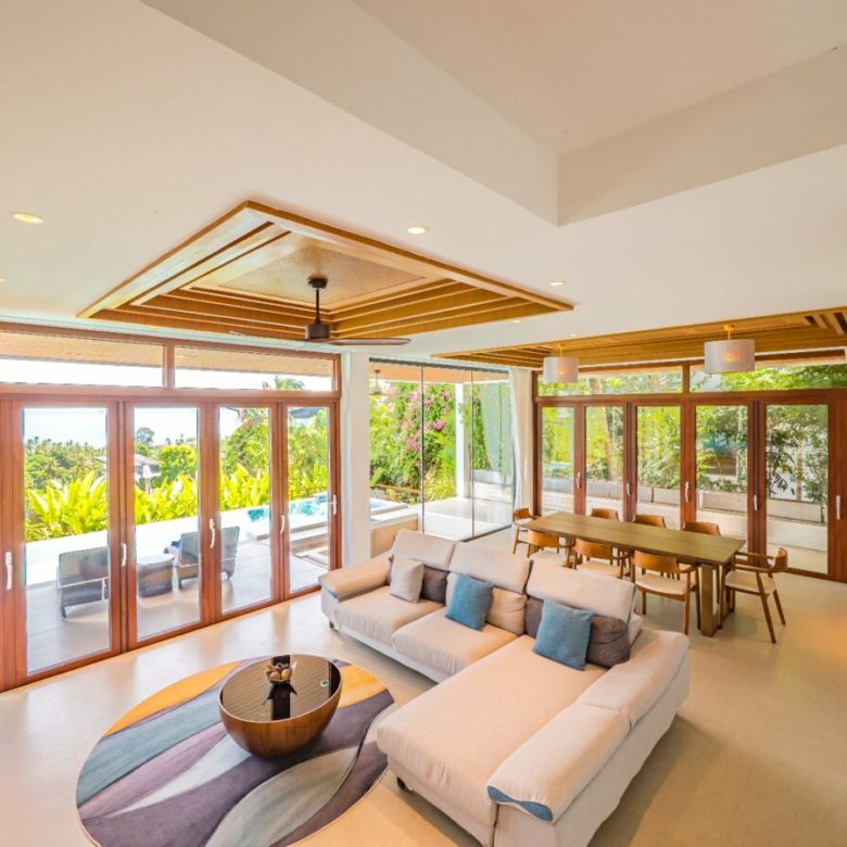 This exceptional villa boasts four spacious en-suite bedrooms, each designed with contemporary elegance and featuring tropical hardwood finishes. The master bedroom captures the essence of tranquility, with a dressing room and large sliding doors that open onto a balcony overlooking the sparkling swimming pool and scenic ocean beyond.