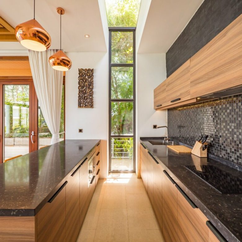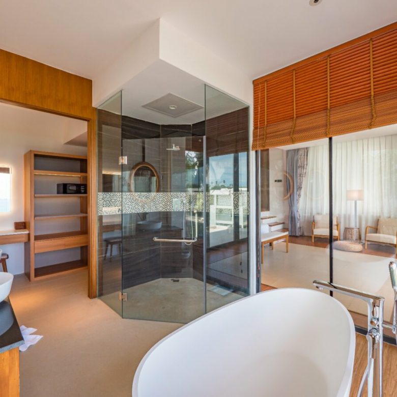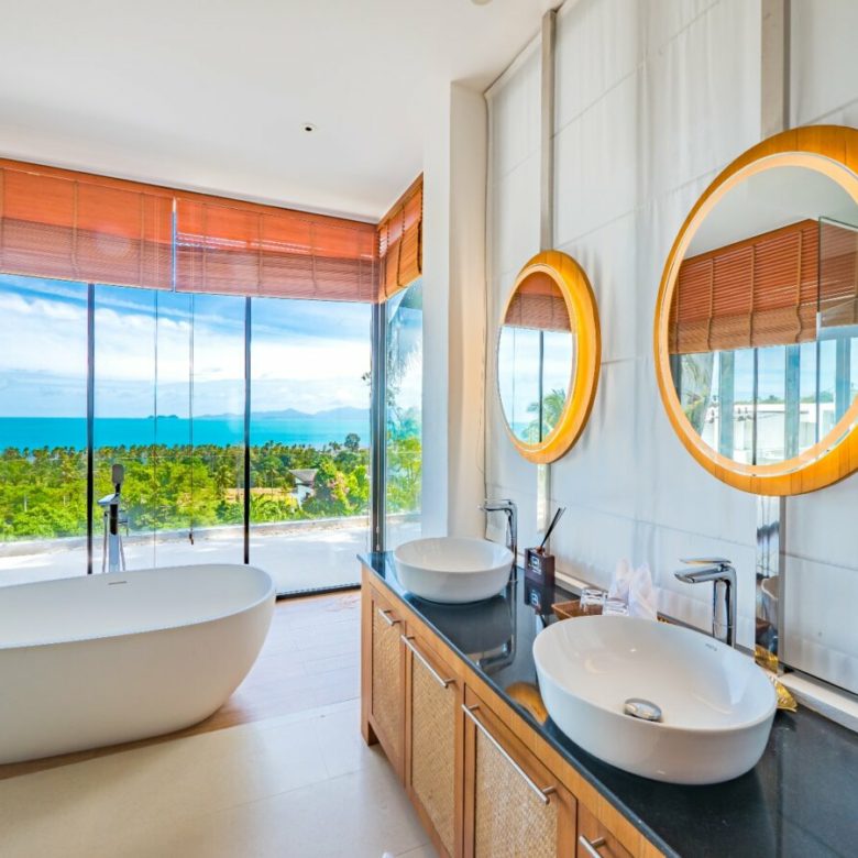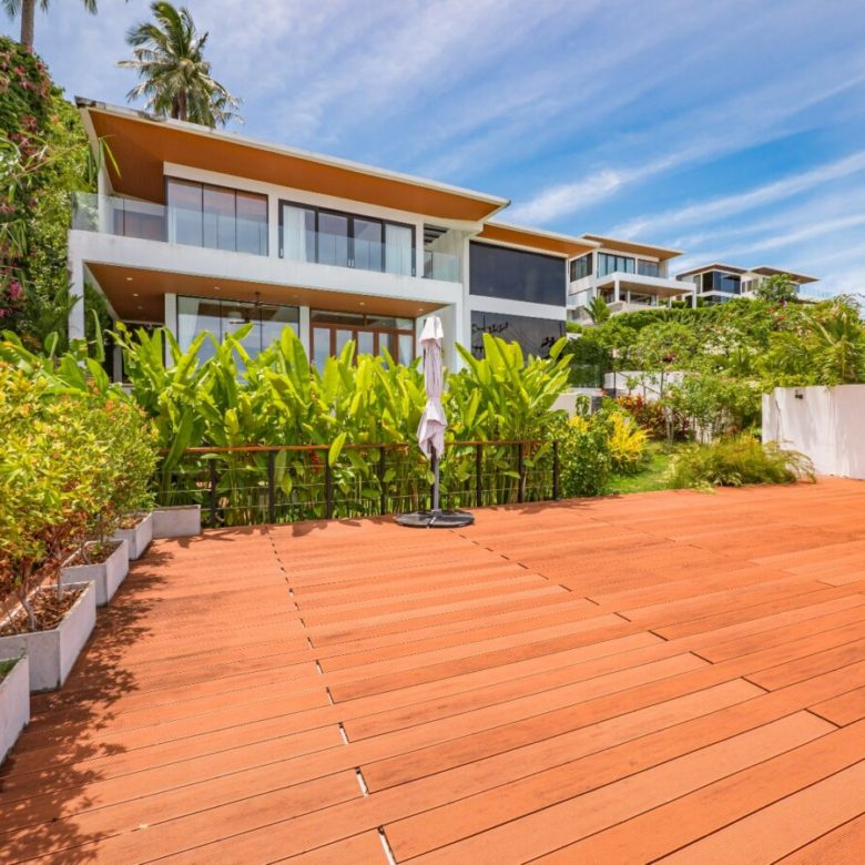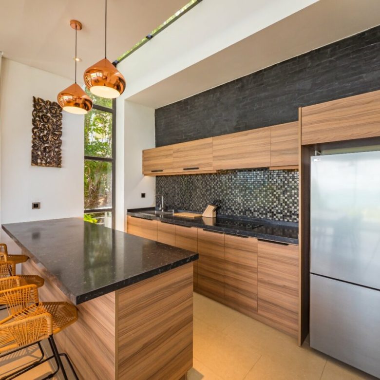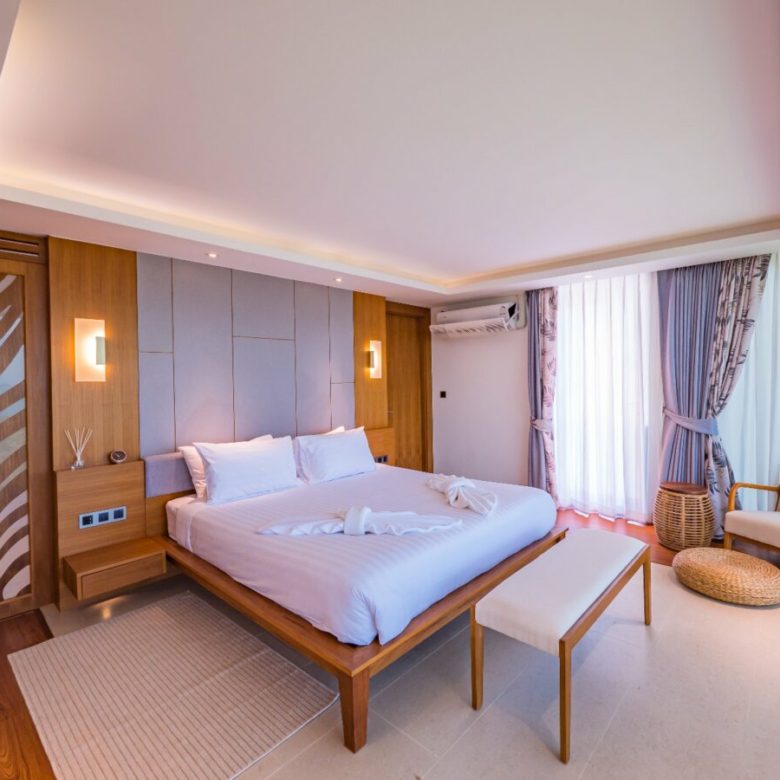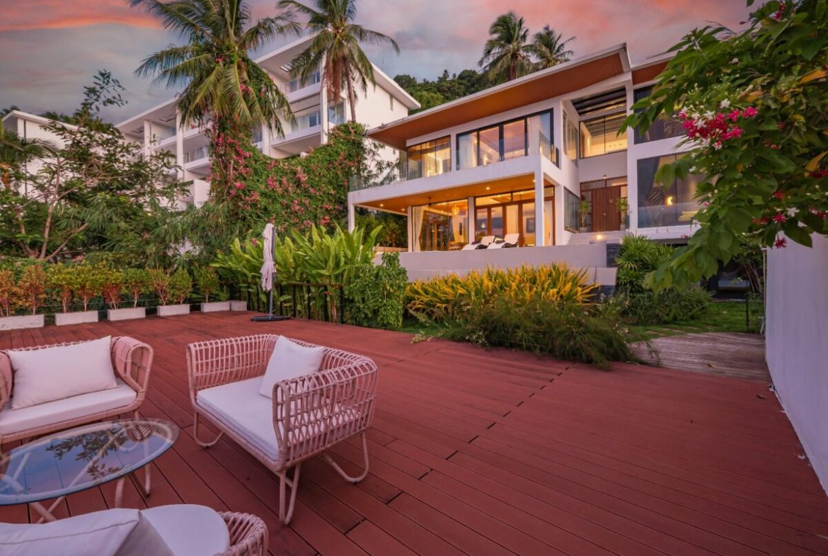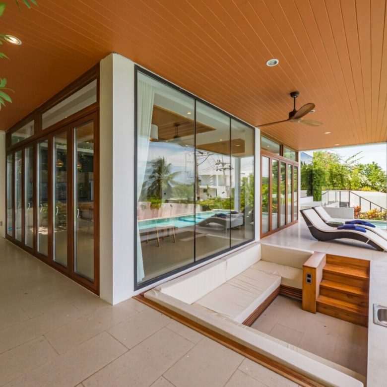 This exceptional villa boasts four spacious en-suite bedrooms, each designed with contemporary elegance and featuring tropical hardwood finishes. The master bedroom captures the essence of tranquility, with a dressing room and large sliding doors that open onto a balcony overlooking the sparkling swimming pool and scenic ocean beyond.