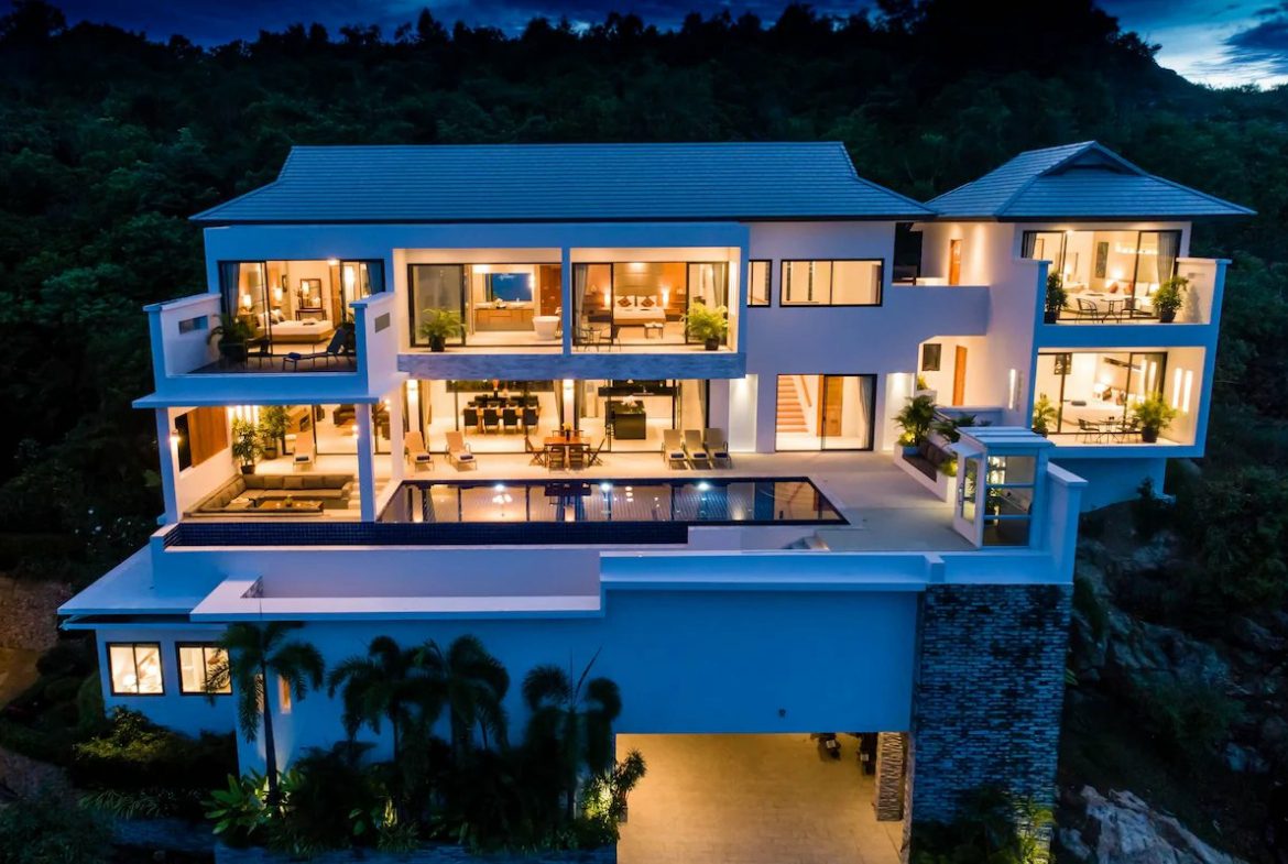This new luxurious Beach View Villa with 5 Bedrooms is located in an exclusive enclave of custom built homes in the most desirable area of Koh Samui. The hillside location gives you breathtaking views and total privacy. Yet, you are only 100 meters from the beach and minutes from the best hotels and restaurants on the island. You look out on to one of the most beautiful views in the world and with total privacy even while swimming in your infinity pool.